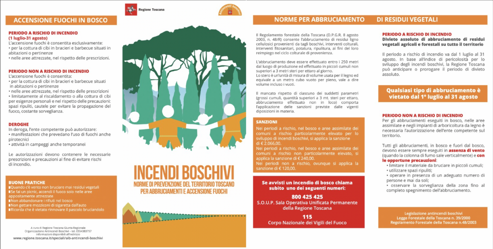 - Al fine di fornire adeguata informazione all’utenza in relazione alla pratica dell’abbruciamento si allega brochure redatta dagli uffici regionali competenti, sempre disponibile sul sito: https://www.regione.toscana.it/emergenza-e-sicurezza/speciali/aib-antincendi-boschivi?fbclid=IwY2xjawJGJ3hleHRuA2FlbQIxMAABHeDGLQCkCZ9X-_MfOiqqD8w5M76k3pYamLDC8vpGNDJ1vuwSampTJ36aNg_aem_j6189qz70n2Ih68KaDvOqg , dove è possibile anche prendere visione del bollettino quotidiano rischio incendi.