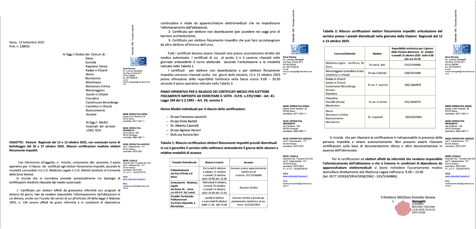 Elezioni Regionali del 12 e 13 ottobre 2025, con eventuale turno di ballottaggio del 26 e 27 ottobre 2025. Rilascio certificazioni mediche elettori fisicamente impediti.