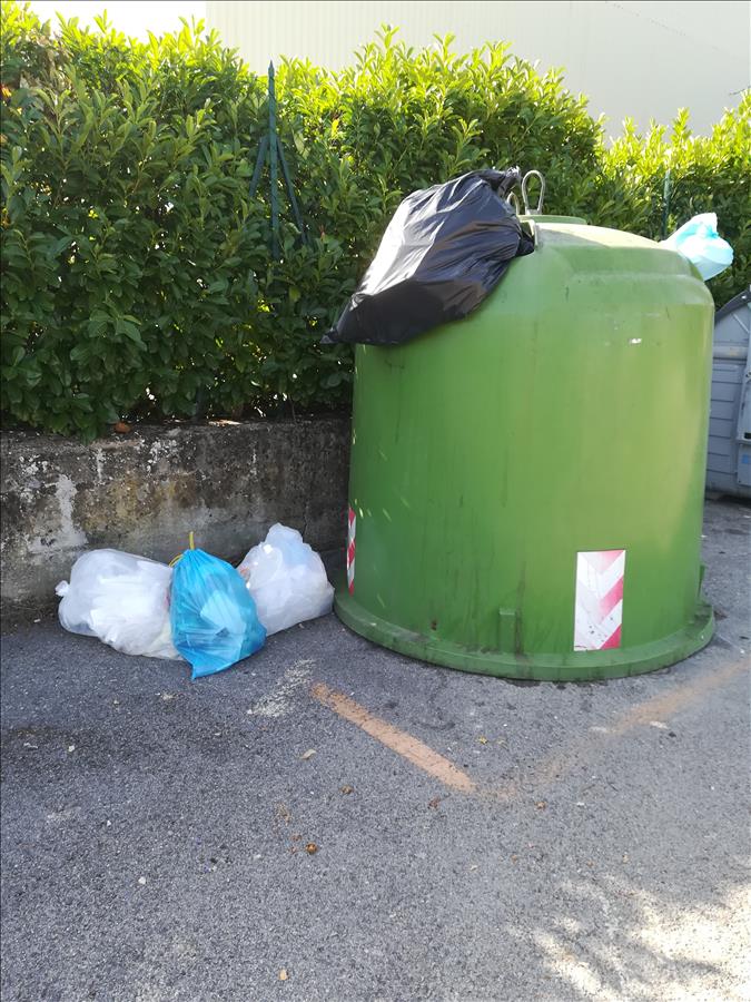 Buongiorno. Il cassonetto dell'indifferenziato dietro i giardini della coop è aperto e la calotta incastrata. La campana della plastica strabocca con sacchi fuori. Anche la campana della plastica alla stazione è traboccante