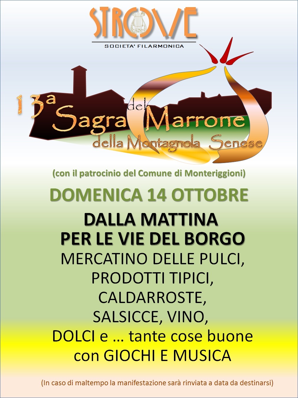 Domenica 14 Ottobre, nel borgo di Strove (Monteriggioni – SI), si svolgerà la 13^ sagra del Marrone della Montagnola Senese. Dal mattino per le vie del paese ci saranno mercatino, prodotti tipici, caldarroste, salsicce, vino, dolci ecc..