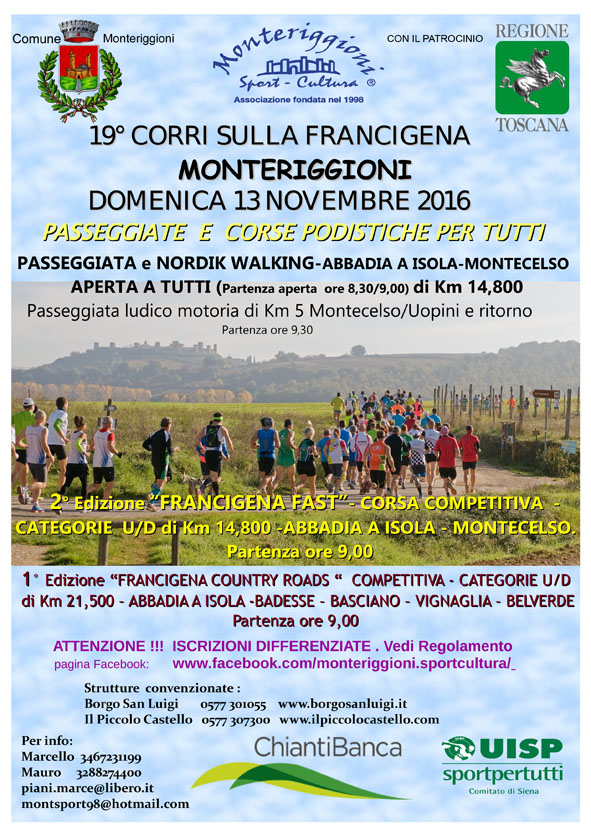Domenica 13 novembre 2016 si svolgerà nel territorio di Monteriggioni "Corri sulla Francigena"; La manifestazione è organizzata da Monteriggioni Sport Cultura ASD in collaborazione con CHIANTIBANCA e con il Patrocinio del COMUNE di MONTERIGGIONI.