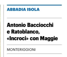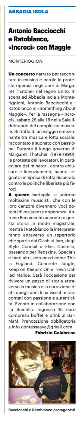 Sabato 28 Febbraio, alle ore 18, presso il complesso monumentale di Abbadia Isola (Monteriggioni -SI) nuovo appuntamento con la rassegna Incroci con il concerto narrato dal titolo "Something About Maggie", a cura di Antonio Bacciocchi e Rotoblanco.