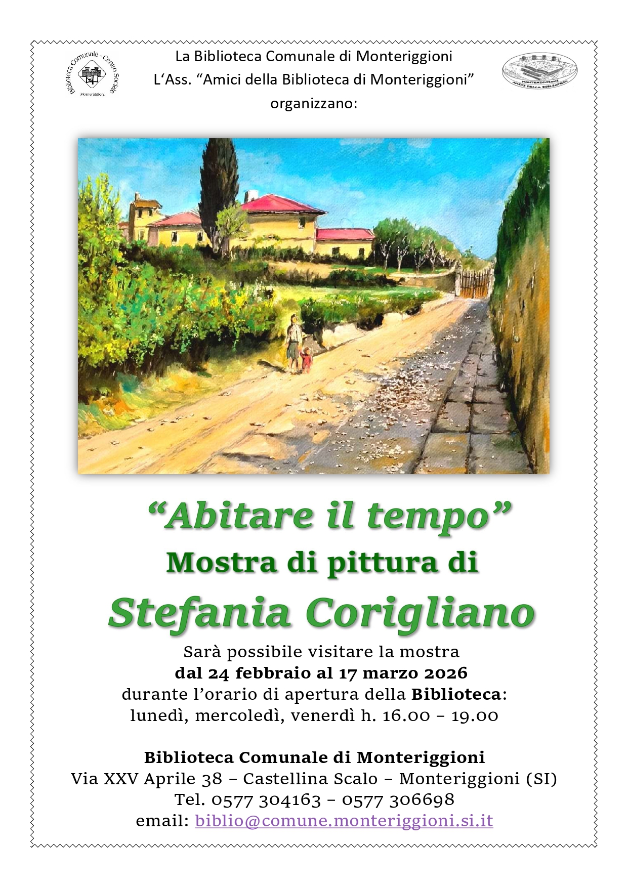 Dal 24 febbraio al 17 marzo sarà possibile visitare presso la Biblioteca Comunale di Monteriggioni, in Via XXV Aprile 38 a Castellina Scalo, durante l’orario di apertura, la mostra di pittura di Stefania Corigliano dal titolo: “Abitare il tempo”.