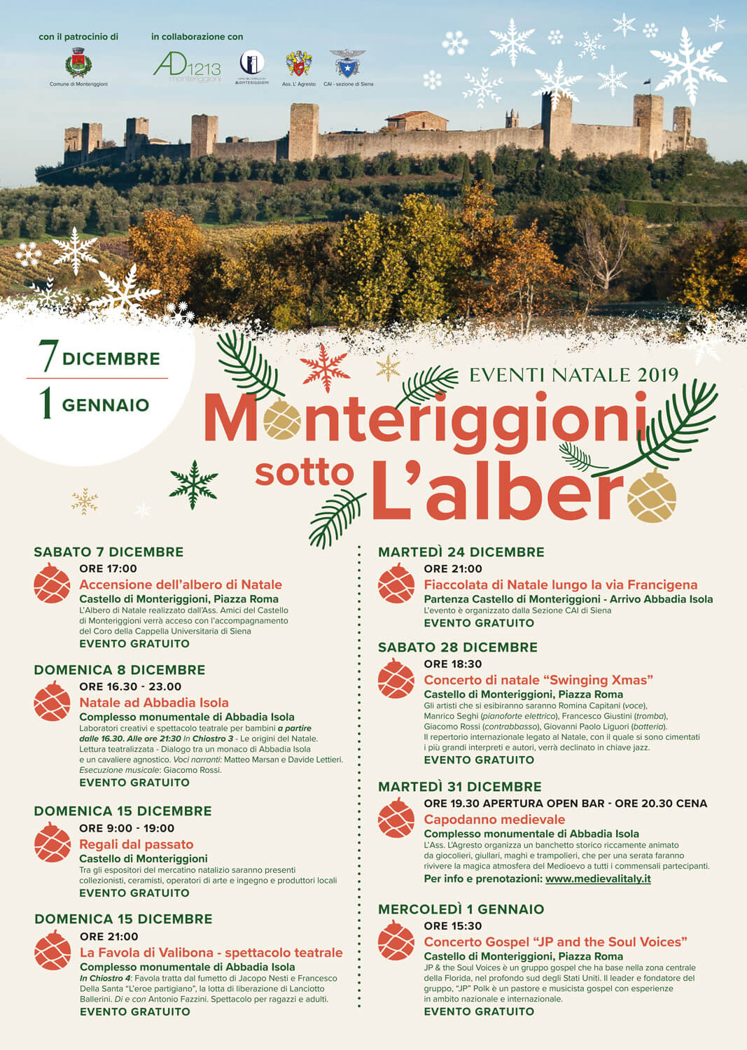 Il 7 dicembre alle ore 17.00 l'Albero di Natale realizzato dall'Ass. Amici del Castello di Monteriggioni verrà acceso in Piazza Roma con l'accompagnamento del Coro della Cappella Universitaria di Siena.