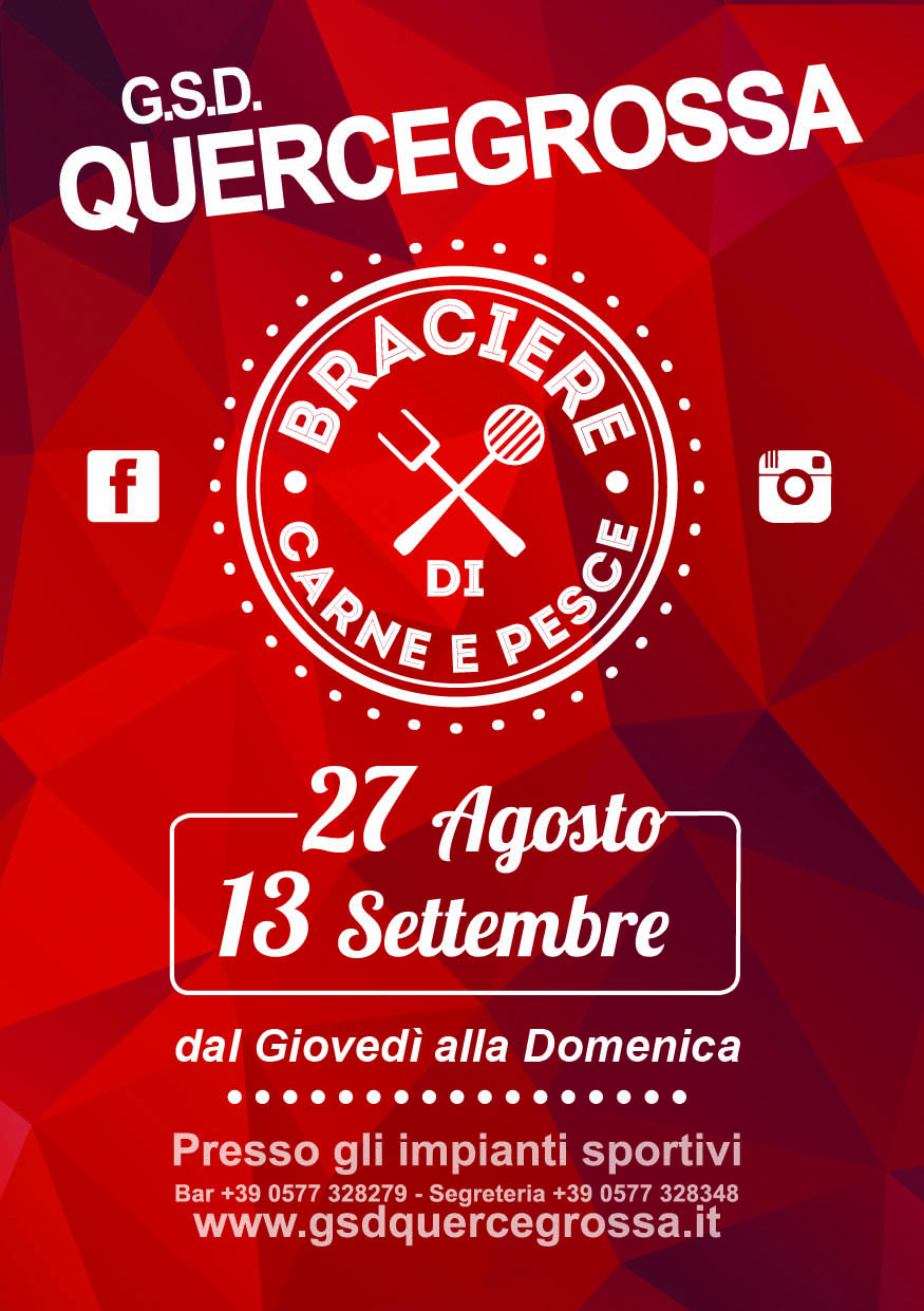 Dal 27 agosto al 13 settembre (dal giovedì alla domenica), presso gli impianti sportivi di Quercegrossa, G.S.D. Quercegrossa organizza il "Braciere di carne e pesce".