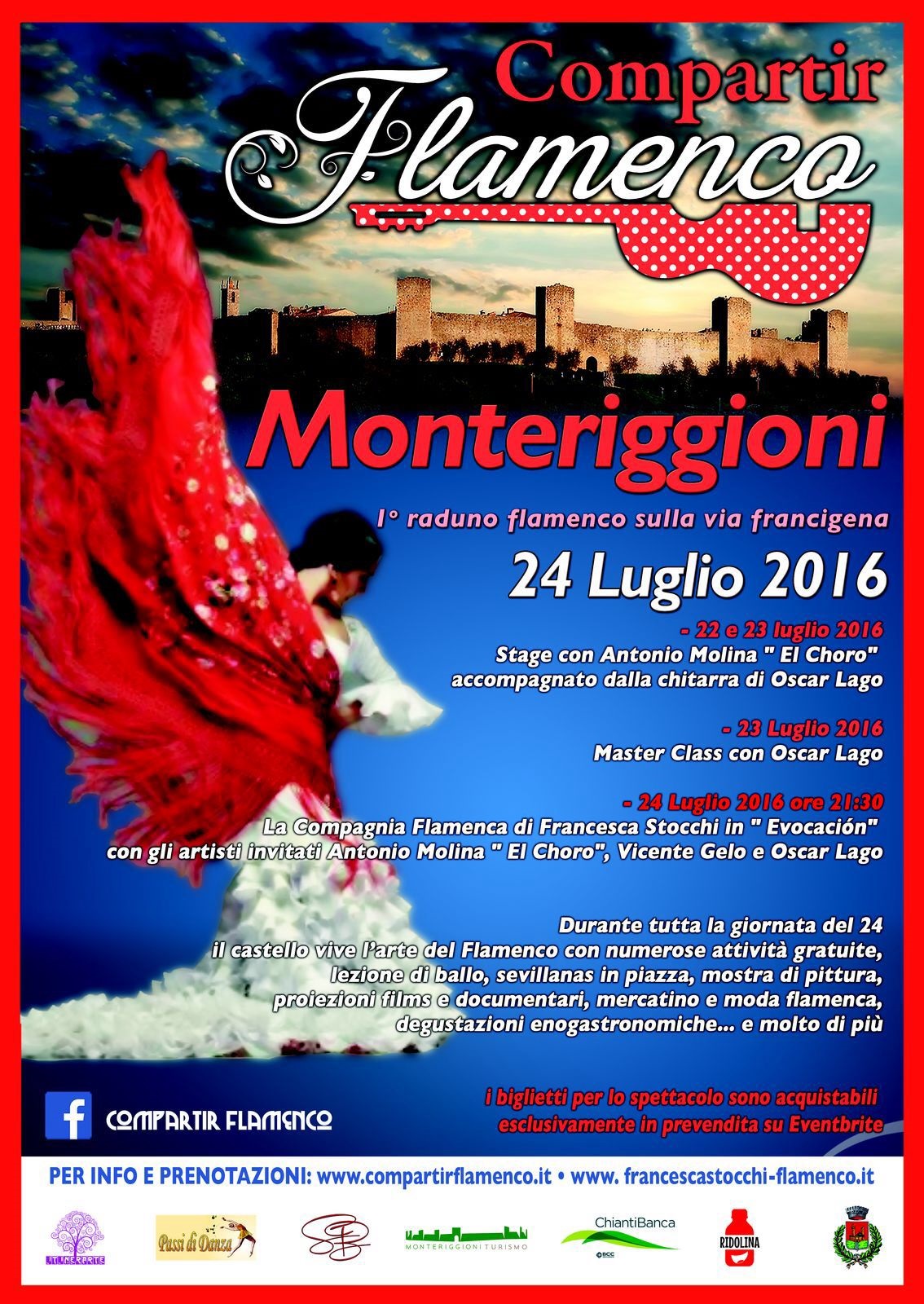 Il 24 luglio dalle 11.30 alle 22.00 si svolgerà a Monteriggioni, in Piazza Roma, un'intera giornata di eventi legata al Flamenco e dedicati ad amatori e curiosi. Mostre fotografiche e di pittura, proiezione di documentari e film, lezioni gratuite di danza e musica, tetaro cinema e buona compagnia. A conclusione la prima italiana assoluta dello spettacolo EVOCACION della Compagnia Flamenca Italo Spagnola di Francesca Stocchi.