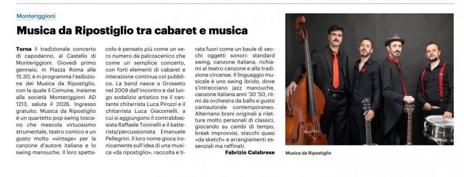 Monteriggioni. Giovedi primo gennaio, in Piazza Roma alle 15.30, è in programma l'esibizione dei Musica da Ripostiglio, con la quale il Comune, insieme alla società Monteriggioni AD 1213, saluta il 2026. Ingresso gratuito. Musica da Ripostiglio è un quartetto pop swing toscano che mescola virtuosismo strumentale, teatro comico e un gusto molto «vintage» per la canzone d'autore italiana e lo swing manouche. Il loro spettacolo è pensato più come un vero numero da palcoscenico che come un semplice concerto, con forti elementi di cabaret e interazione continua col pubblico. La band nasce a Grosseto nel 2009 dall'incontro e dal lungo sodalizio artistico tra il cantante chitarrista Luca Pirozzi e il chitarrista Luca Giacomelli, a cui si aggiungono il contrabbassista Raffaele Toninelli e il batterista/percussionista Emanuele Pellegrini. Il loro nome gioca ironicamente sull'idea di una musica «da ripostiglio», raccolta e tirata fuori come un baule di vecchi oggetti sonori: standard swing, canzone italiana, richiami al teatro canzone e alla tradizione circense. Il linguaggio musicale è uno swing ibrido, dove s'intrecciano jazz manouche,canzone italiana anni '30 '50, ritmi da orchestra da ballo e gusto