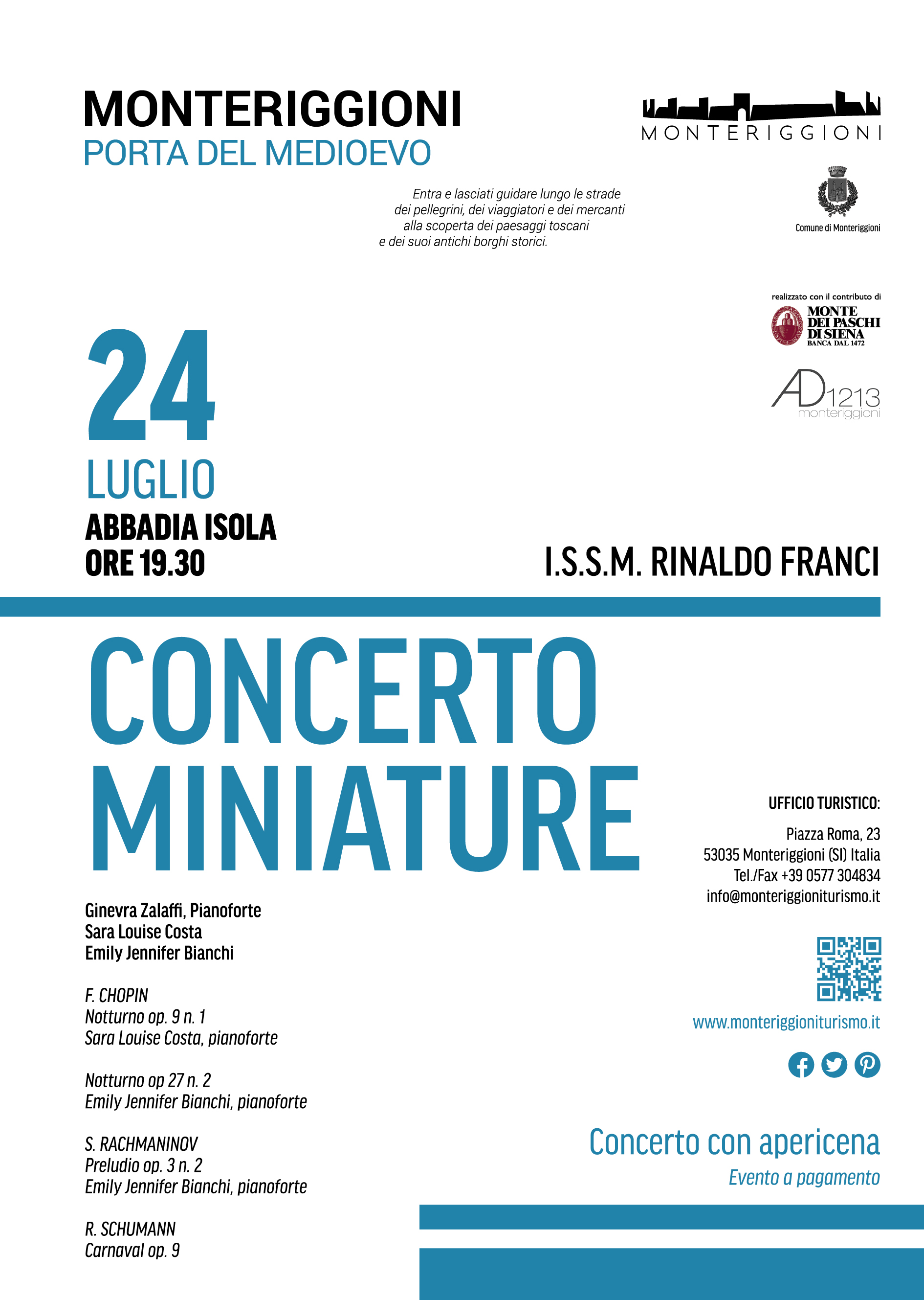 Venerdì 24 luglio, alle 19.30, presso il complesso monumentale di Abbadia Isola, apericena seguito dal concerto “Miniature”, della scuola Rinaldo Franci di Siena.