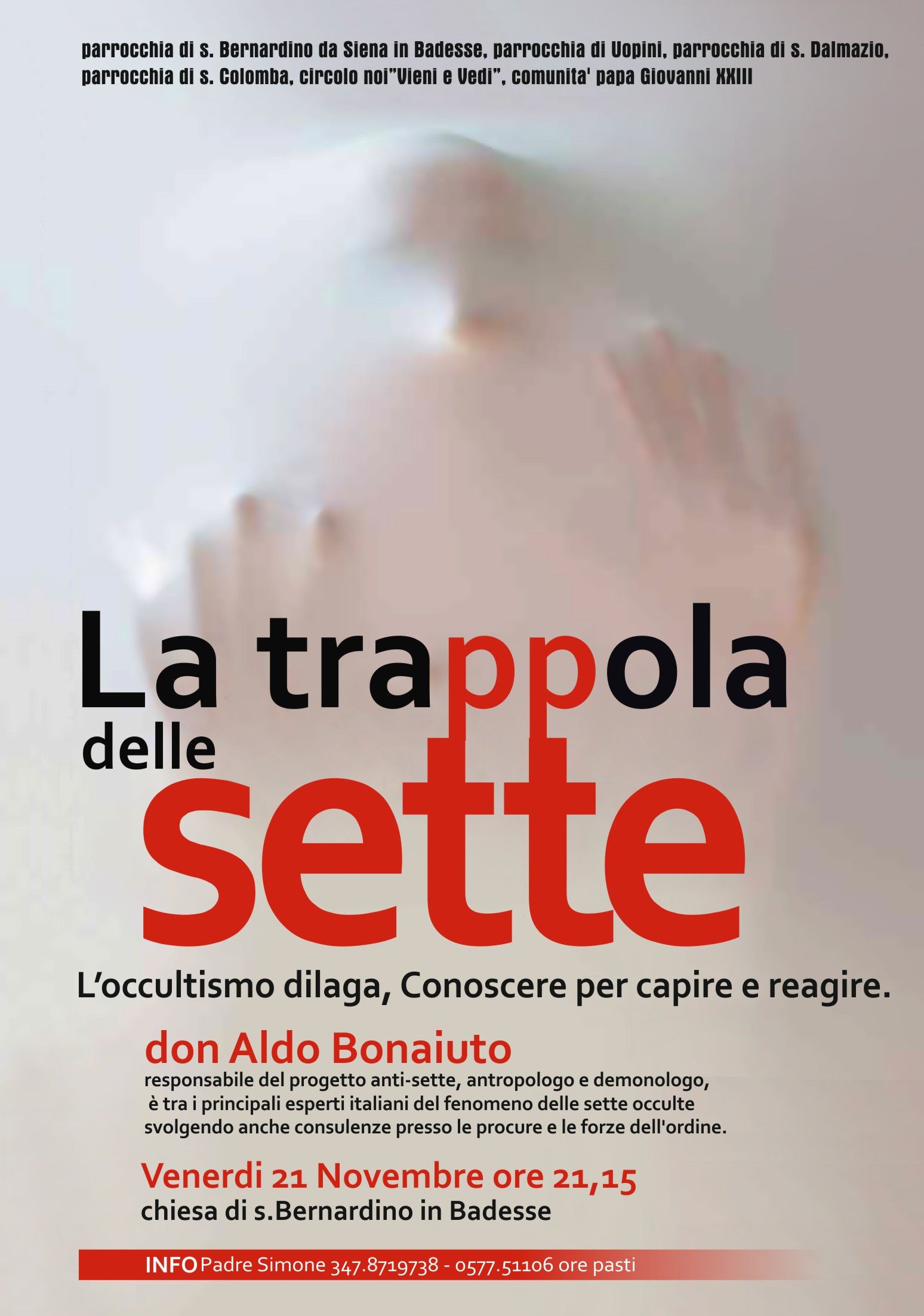 l'Associazione Oratorio "Vieni e Vedi" organizza per il giorno 21 Novembre alle ore 21.15 presso la chiesa di San Bernardino in Badesse, una conferenza sull'occultismo e le sette.