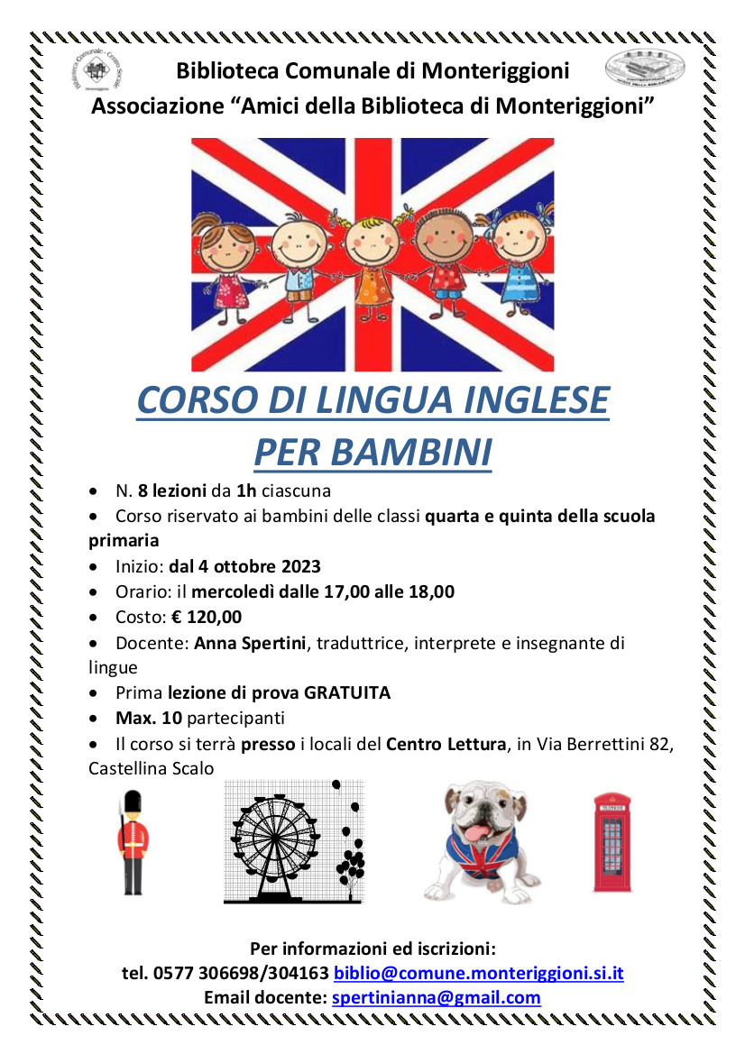 A partire dal 4 ottobre si svolgerà un corso di inglese per bambini organizzato dalla Biblioteca Comunale di Monteriggioni.