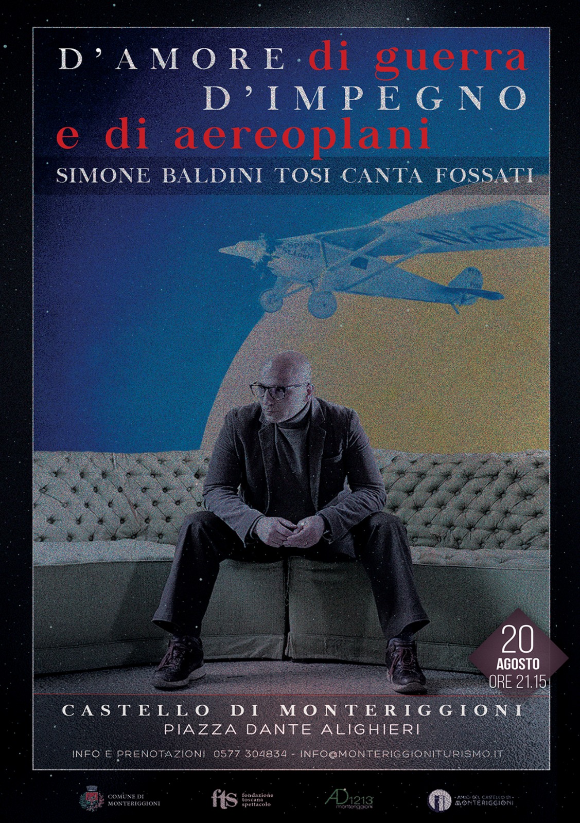 Simone Baldini Tosi, accompagnato dal suo ensemble (voce, archi, basso e chitarra), reinterpreta il repertorio di Ivano Fossati, intrecciando in un sound ricercato sospeso fra passato e futuro, l’armonia antica degli archi e la ritmica elettronica. Un concerto che, pur nella assoluta fedeltà all’originale, non si limita ad essere un tributo musicale, ma riesce a rendere contemporanee le parole e l’energia delle canzoni del grande cantautore.