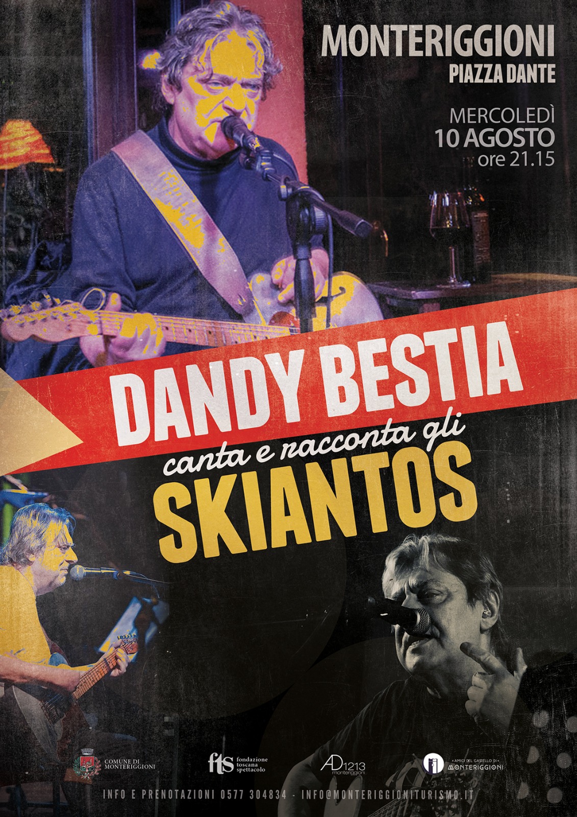 Dandy Bestia (al secolo Fabio Testoni) è lo straordinario chitarrista degli Skiantos che ripercorrerà la loro storia raccontando, suonando e cantando a Monteriggioni.