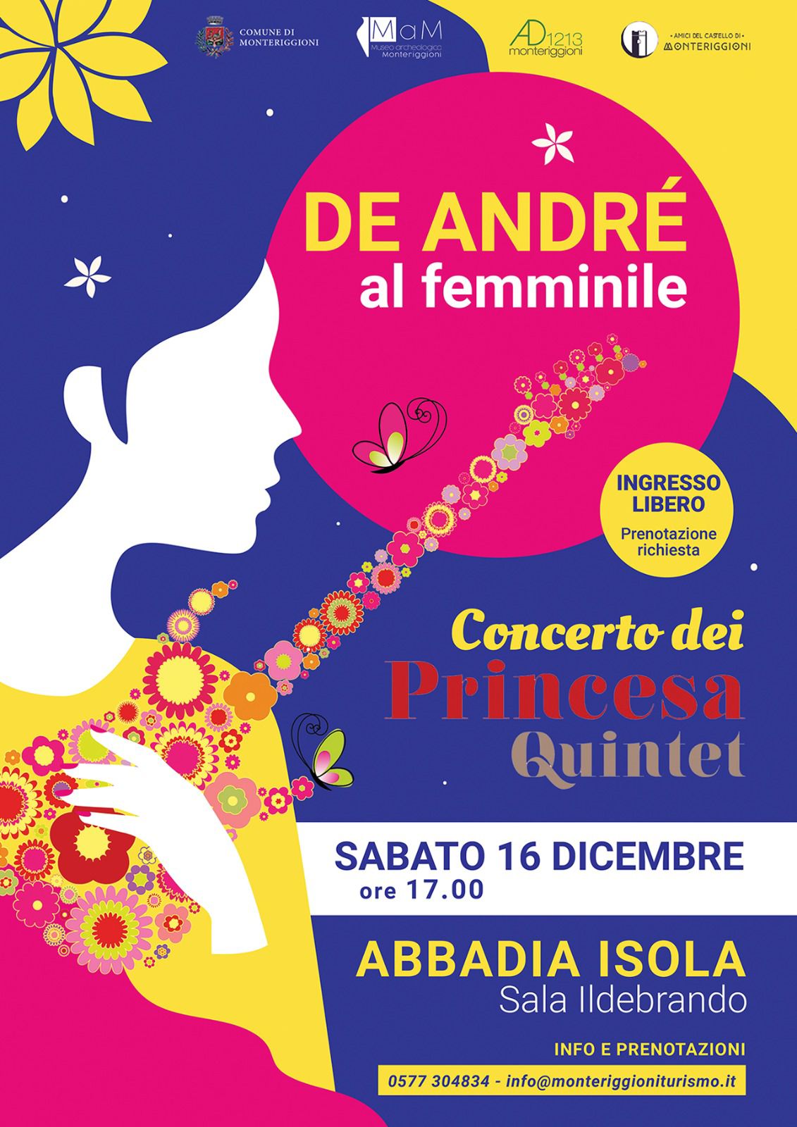 Sabato 16 dicembre alle ore 17, presso il Complesso Monumentale di Abbadia Isola (Sala Ildebrando), si terrà il bellissimo concerto dei Princesa Quintet: De Andrè al femminile.