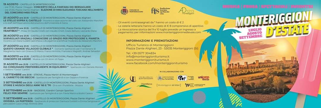 L’evento fa parte del cartellone eventi estivi promossi dal Comune di Monteriggioni, in collaborazione con Fondazione Toscana Spettacolo Onlus, Monteriggioni AD 1213, Associazione Amici del Castello di Monteriggioni, Associazione La Scintilla.