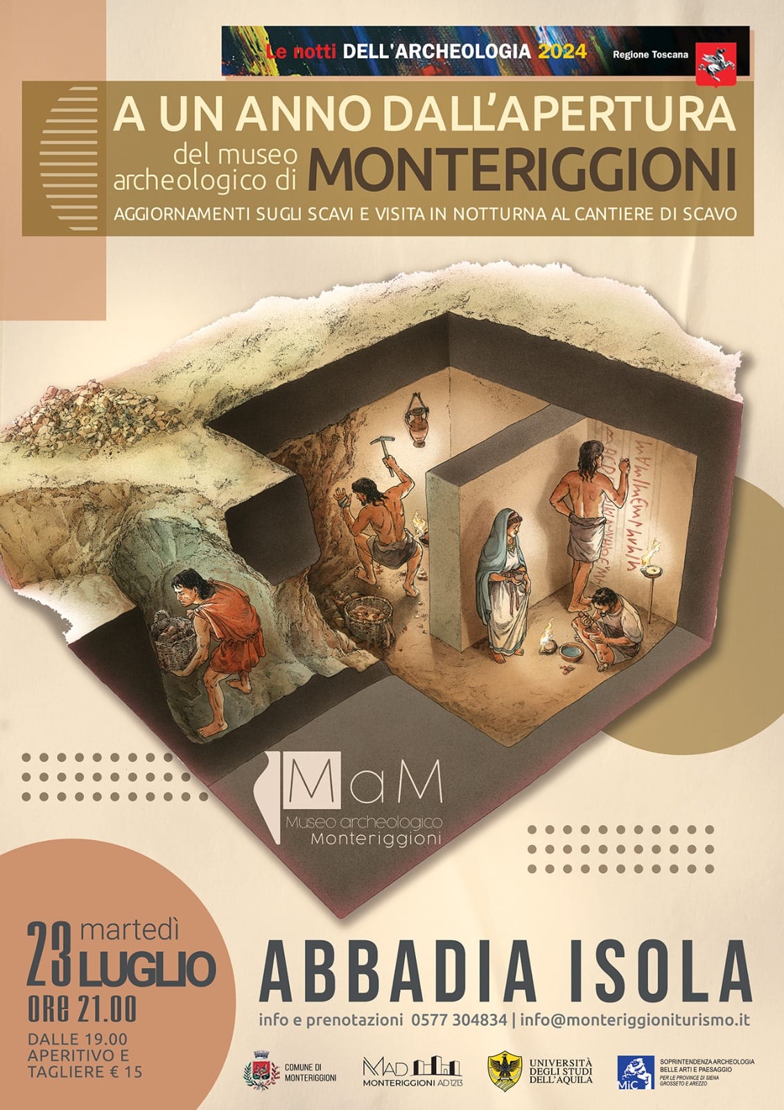Martedì 23 luglio, ore 21:00, ad Abbadia Isola: “A un anno dall’apertura del Museo Archeologico di Monteriggioni”. Serata che inizierà nel chiostro dell’abbazia, con il racconto delle settimane di scavo in corso nella Piana del Casone e la sua estesa necropoli etrusca, e che proseguirà con la visita in notturna del cantiere di scavo guidati dal team di archeologi diretti dal professor Matteo Milletti dell’Università di L’Aquila e da Giacomo Baldini direttore del MaM - Museo Archeologico di Monteriggioni.