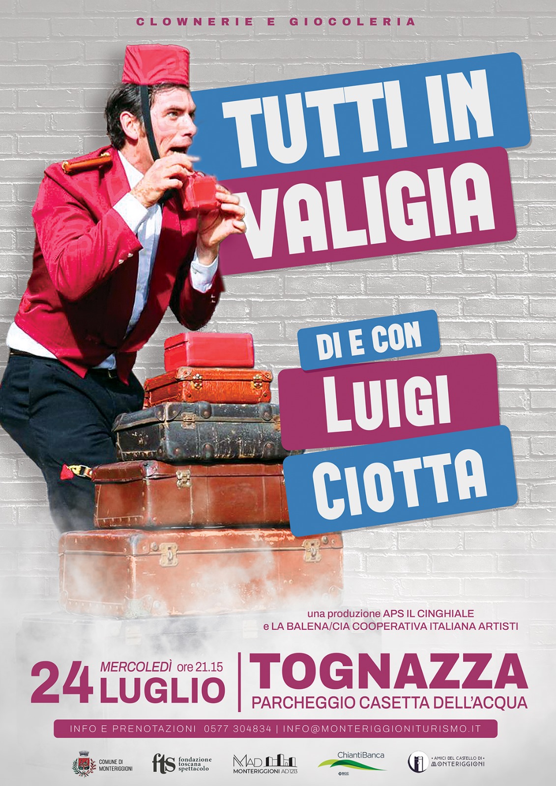 Mercoledì, 24 luglio, ore 21:15, Località La Tognazza al Parcheggio casetta dell'acqua, esilarante spettacolo di clowneria e giocoleria per famiglie: “Tutti in Valigia” di e con Luigi Ciotta (una produzione Aps il Cinghiale e la balena/Cia Cooperativa Italiana Artisti).