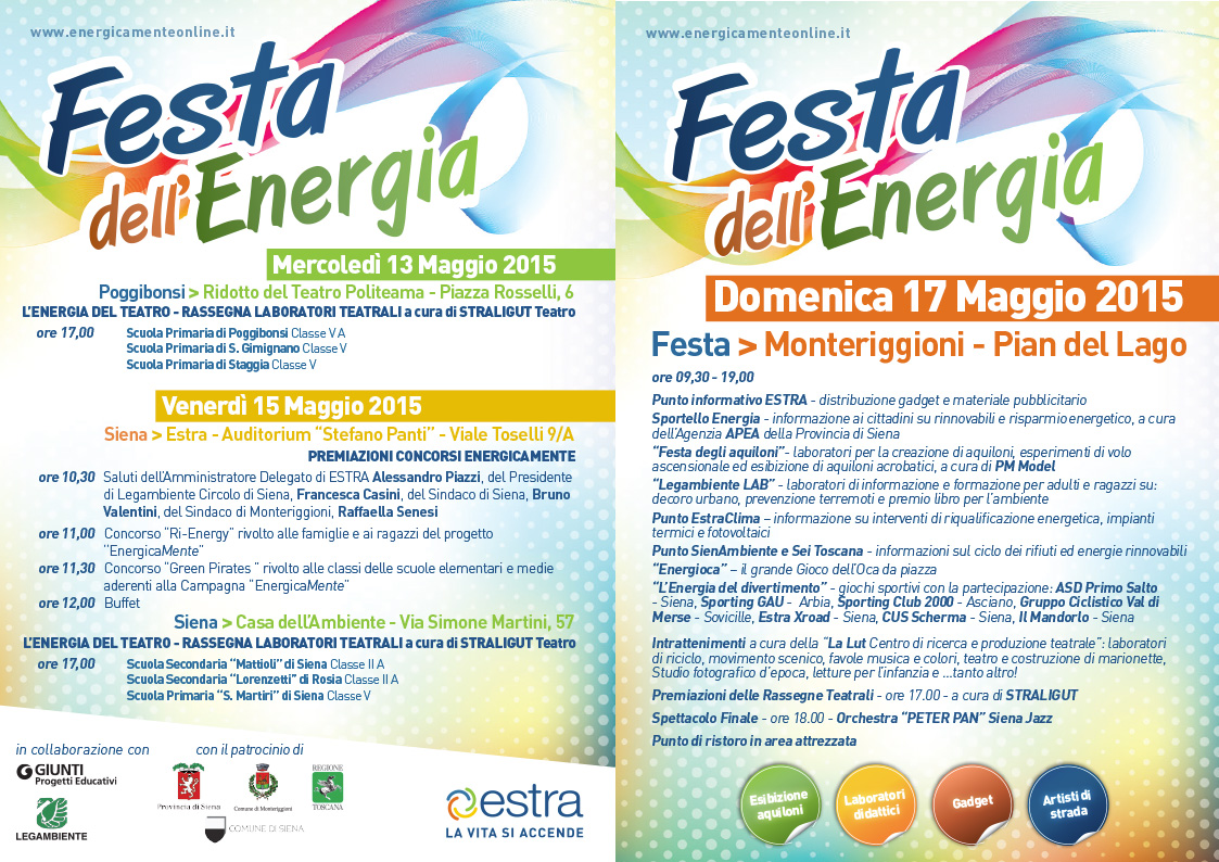 Domenica 17 Maggio, presso l’area verde di Pian del Lago (Monteriggioni-SI) si terrà la Festa dell’Energia, manifestazione per la sensibilizzazione su energie rinnovabili, risparmio energetico e educazione ambientale.