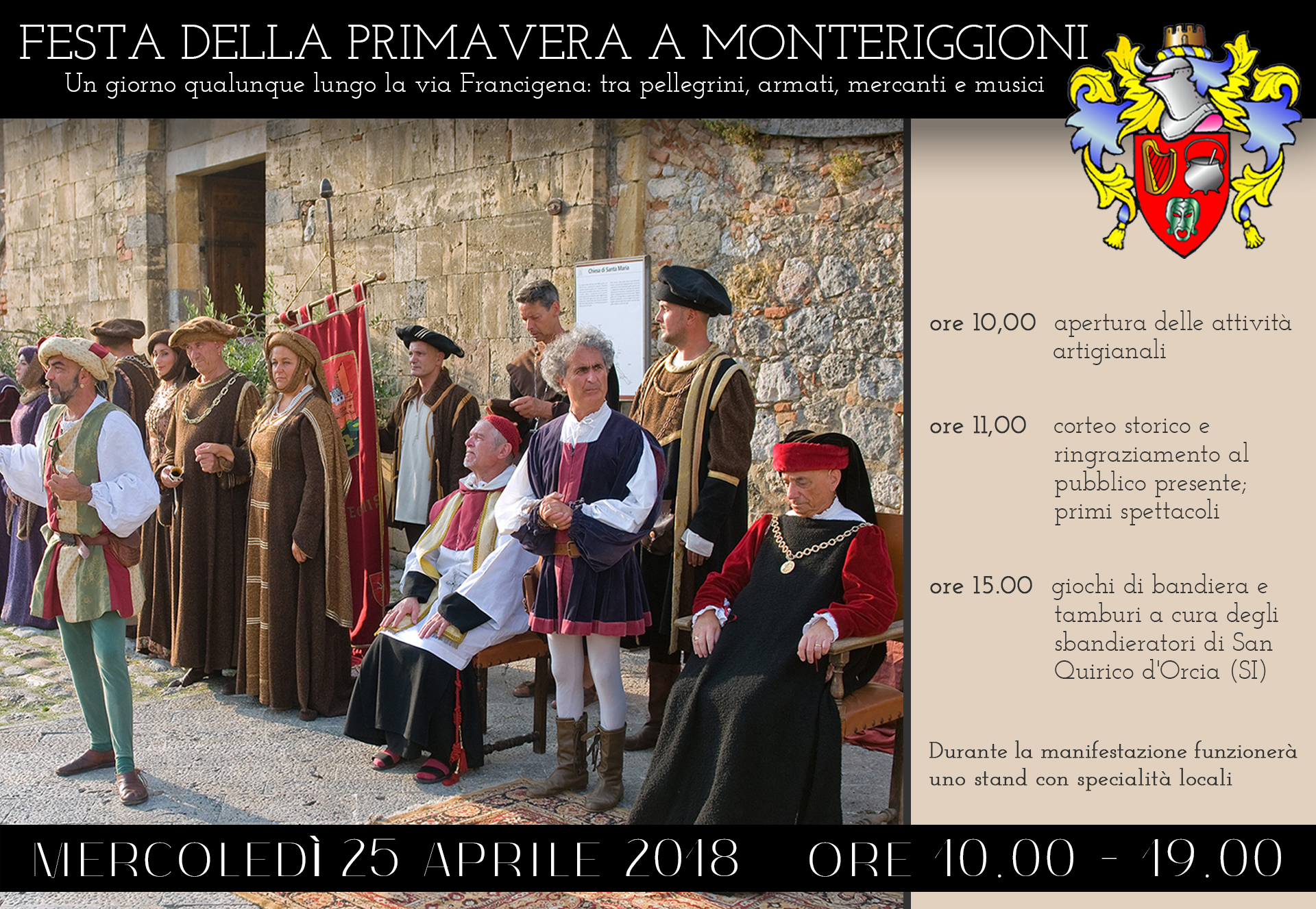 Dalle 10 alle 19 attività artigianali, musici, corteo storico. Alle 15 esibizione degli sbandieratori di San Quirico d'Orcia (SI).