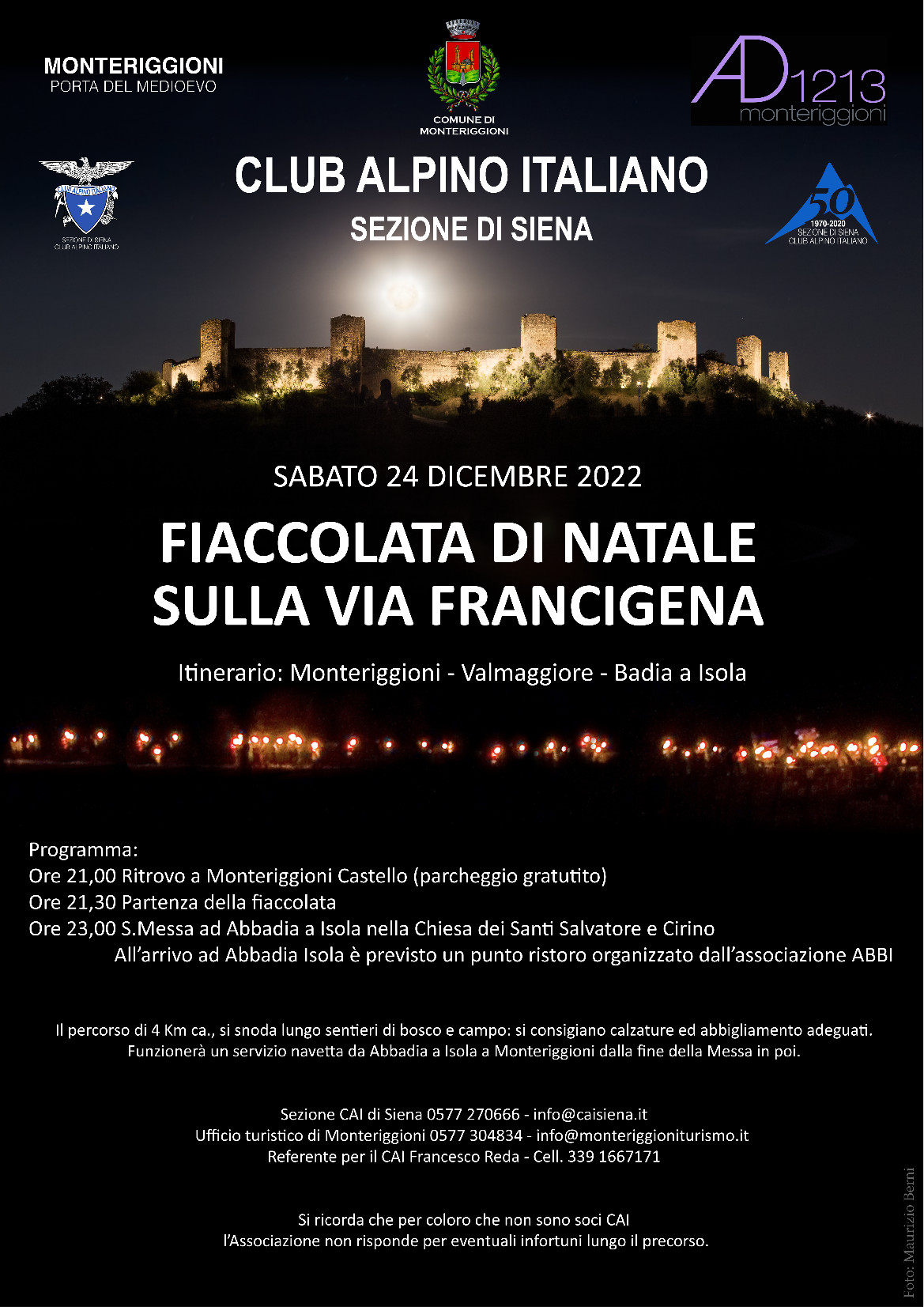 Il 24 dicembre, a cura del CAI (Club Alpino Italiano) sezione di Siena, torna dopo due anni di stop forzato, la tradizionale e straordinaria “Fiaccolata di Natale” che prevede la partenza dal Castello di Monteriggioni camminando sulla Via Francigena fino ad Abbadia Isola.