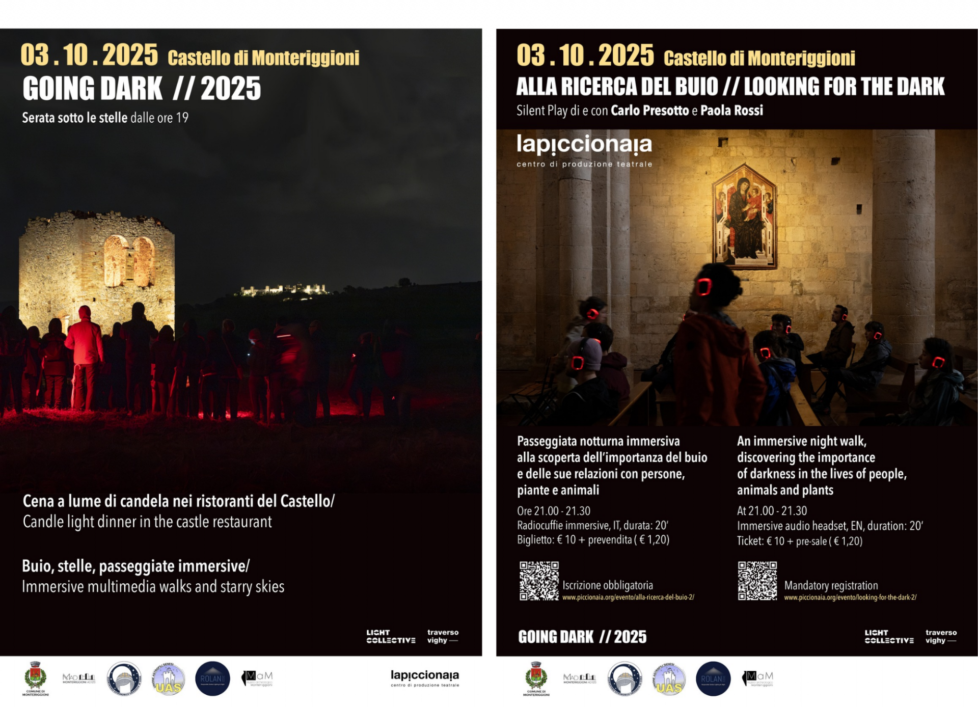Nell’ambito della terza edizione di Going Dark, workshop dedicato alla corretta progettazione della luce negli spazi storici e alla sensibilizzazione sull’inquinamento luminoso, venerdì 3 ottobre 2025 il castello di Monteriggioni ospiterà due iniziative aperte al pubblico.