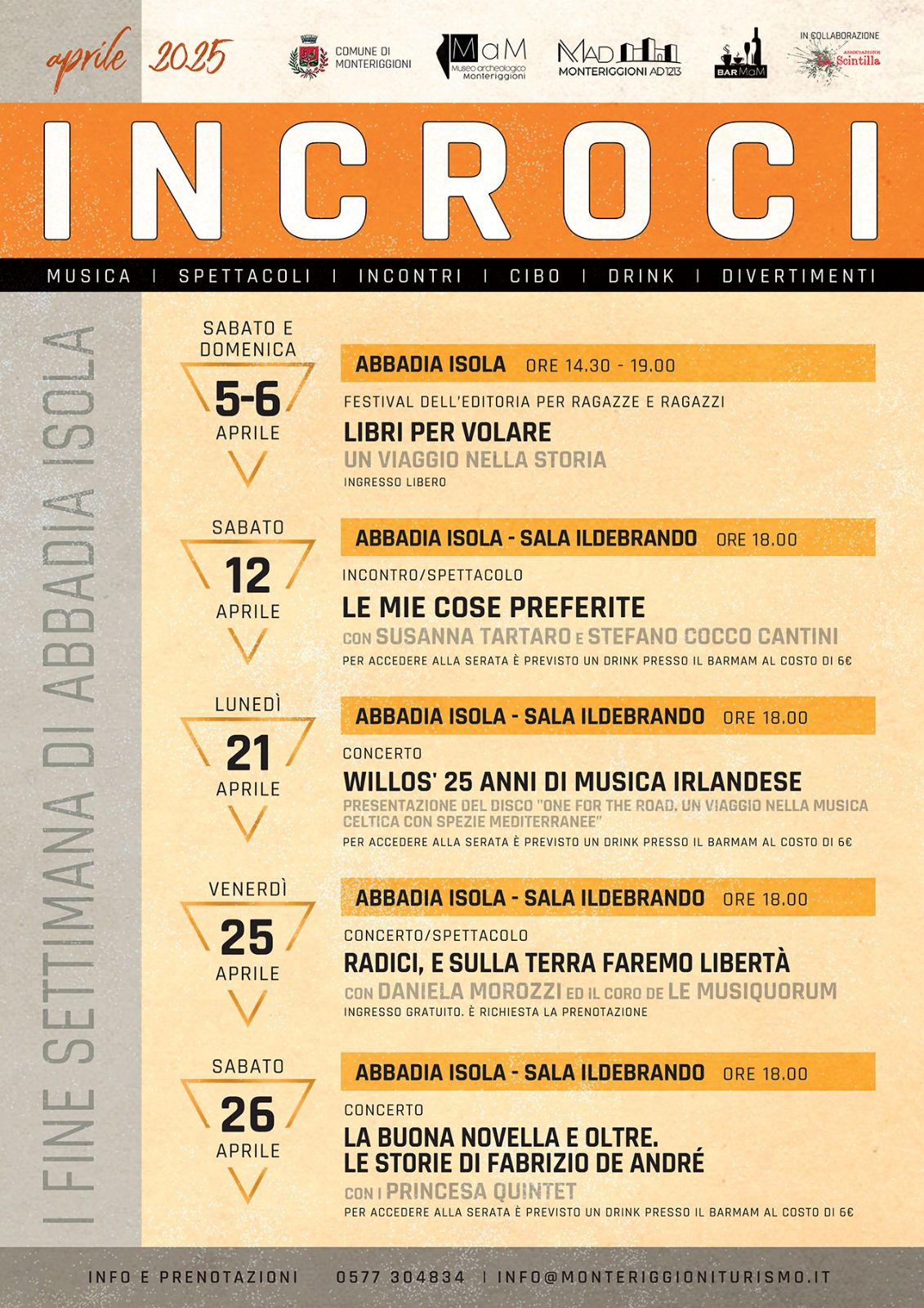 Prosegue anche ad Aprile "I N C R O C I - I fine settimana di Abbadia Isola", rassegna di spettacoli, presentazioni di libri, incontri con personaggi della cultura promossa dal comune di Monteriggioni.