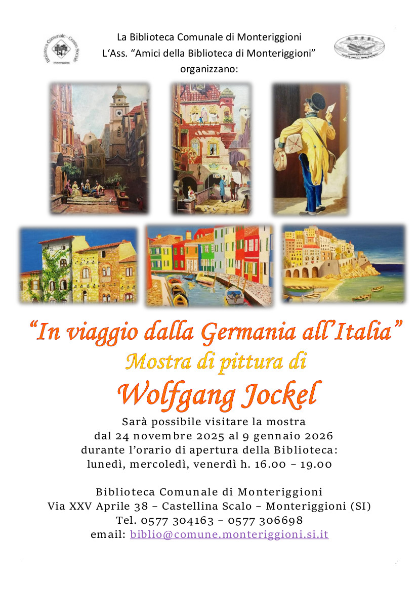 Fino al 9 gennaio 2026, presso la Biblioteca Comunale di Monteriggioni, in Via XXV Aprile 38 a Castellina Scalo, durante l’orario di apertura sarà possibile visitare la mostra di pittura di Wolfgang Jockel dal titolo: “In viaggio dalla Germania all'Italia”.