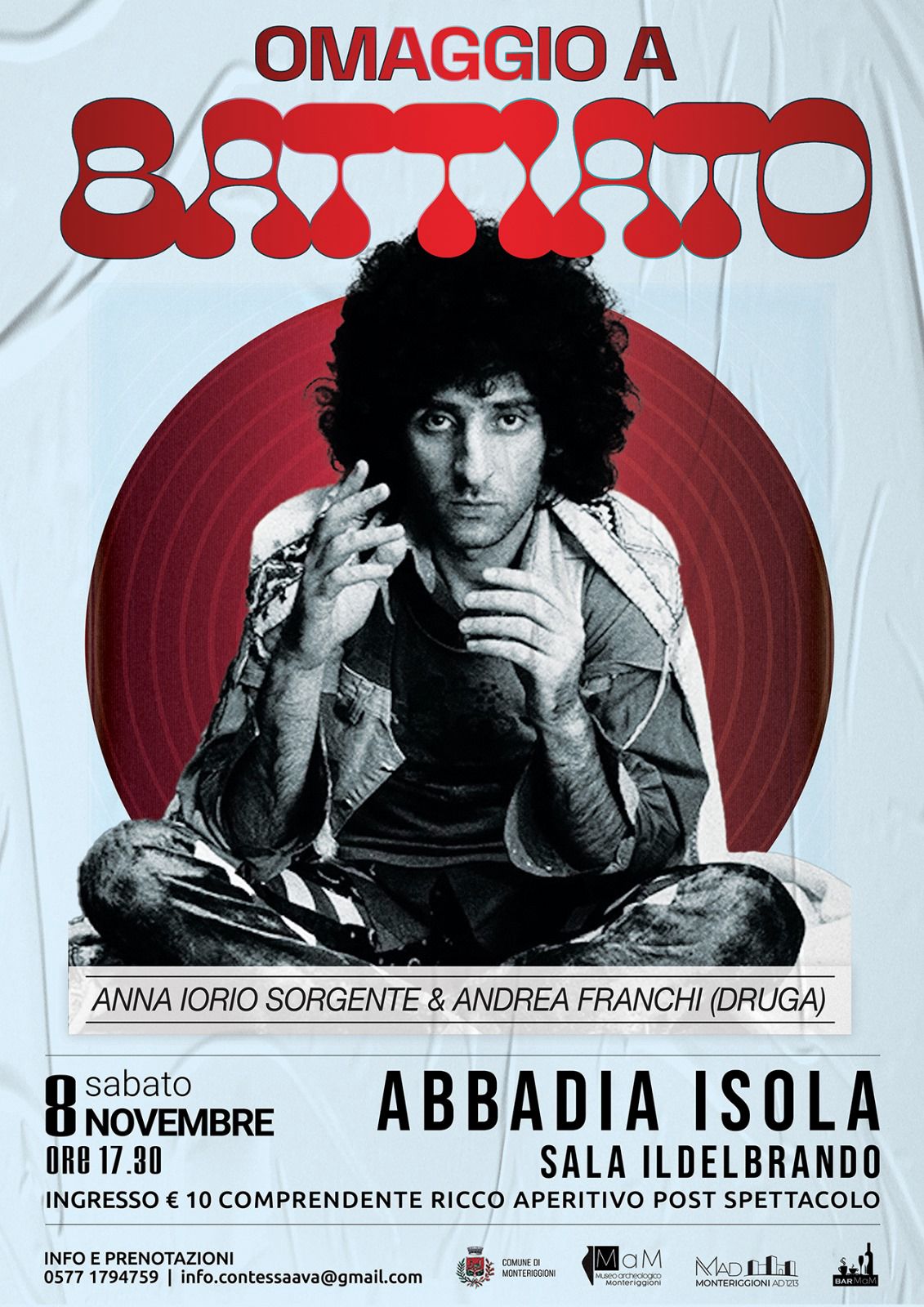 Sabato 8 novembre, ore 17.30 al complesso monumentale di Abbadia Isola (Monteriggioni), Sala Ildebrando, si terrà il concerto “Battiato” con Anna Iorio Sorgente e Andrea Franchi (Druga).