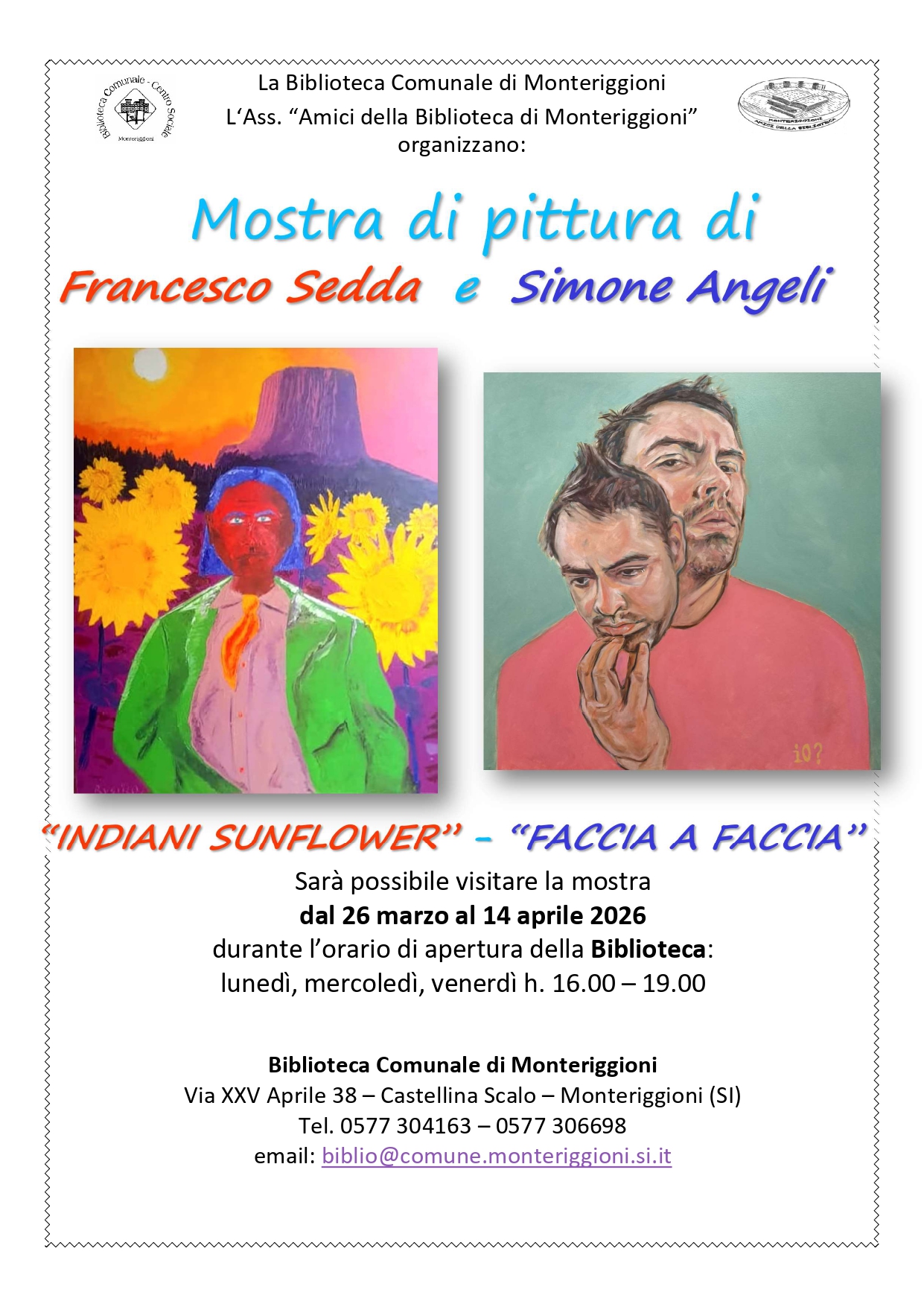 Fino al 14 aprile sarà possibile visitare presso la Biblioteca Comunale di Monteriggioni, in Via XXV Aprile 38 a Castellina Scalo, durante l’orario di apertura, la mostra di pittura di Francesco Sedda e Simone Angeli dal titolo: “Indiani sunflower / Faccia a faccia”.