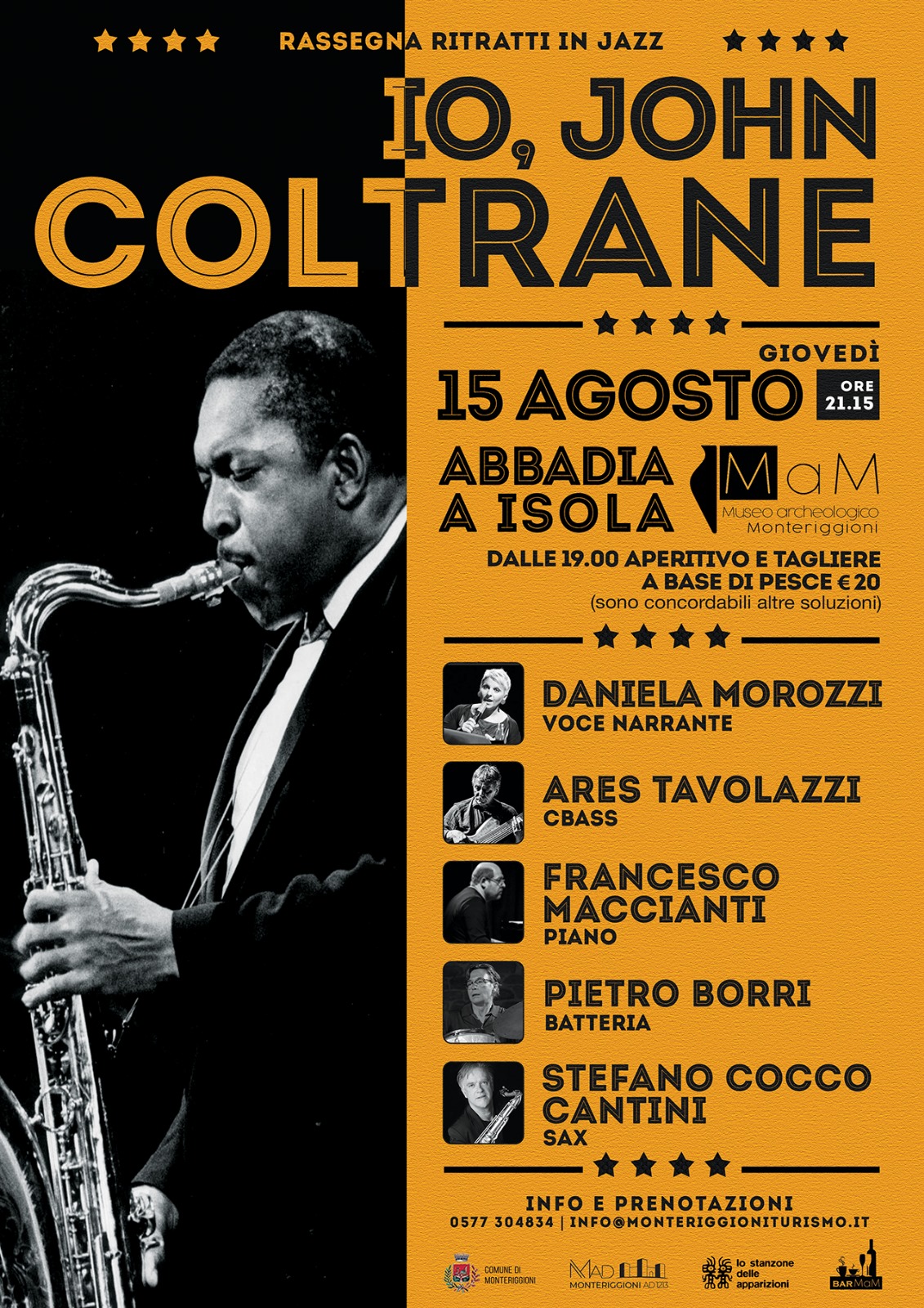 Giovedì 15 agosto, ore 21:15, chiostro di Abbadia Isola, per la rassegna di grande successo "Ritratti in Jazz" è la volta di "Io, John Coltrane", con Daniela Morozzi voce narrante, Ares Tavolazzi Cbass, Francesco Maccianti piano, Pietro Borri batteria, Stefano cocco Cantini sax.