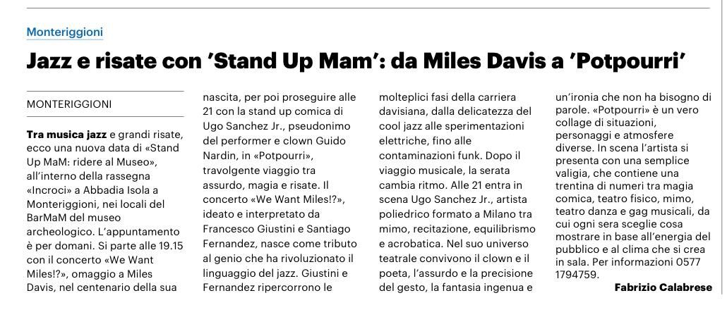 Ore 19.15 concerto “We Want Miles!?”, omaggio a Miles Davis, con Francesco Giustini e Santiago Fernandez.