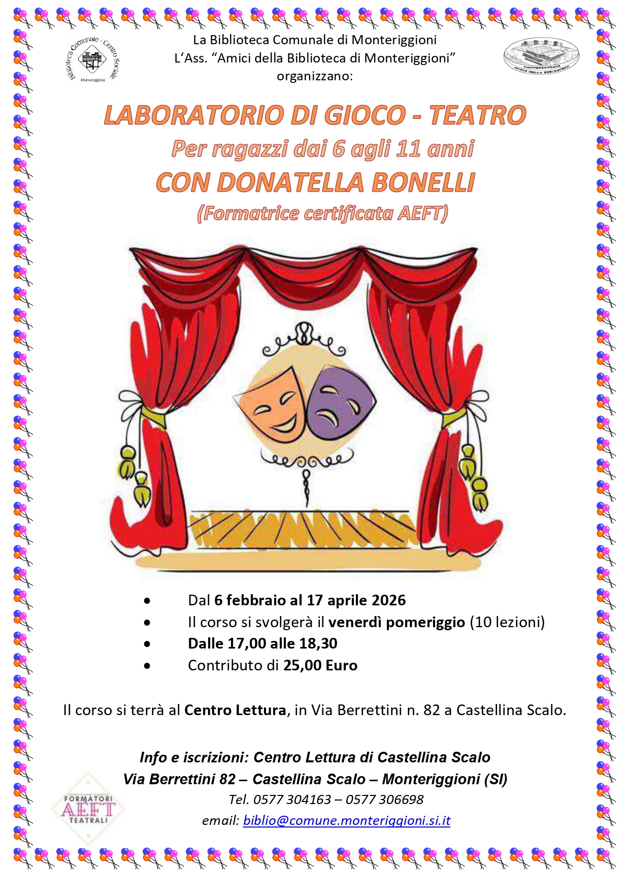 Il laboratorio si svolgerà il venerdì pomeriggio (10 incontri) dalle 17,00 alle 18,30 presso il Centro Lettura di Castellina Scalo.