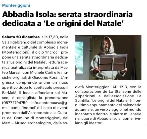 Sabato 20 dicembre, alle ore 17.30, nella Sala Ildebrando del complesso monumentale e culturale di Abbadia Isola (Monteriggioni), il ciclo “Incroci” propone una serata straordinaria dedicata a “Le origini del Natale”, lettura scenica teatralizzata interpretata da Matteo Marsan con Michele Carli e le musiche originali di Giacomo Rossi.