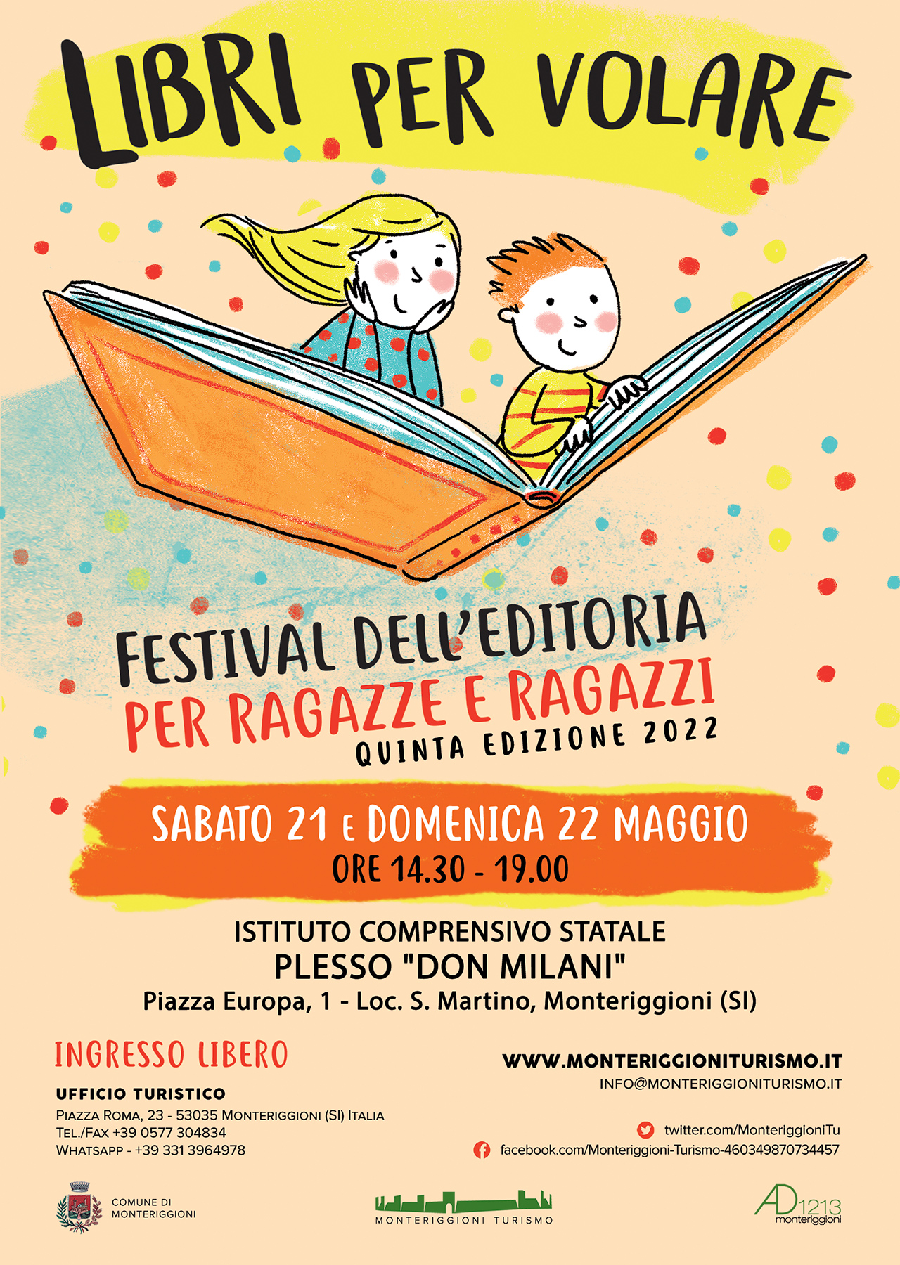 Sabato 21 e domenica 22 maggio, presso l'Istituto comprensivo Plesso Don Milani, loc. San Martino (Monteriggioni-SI), si terrà "Libri per volare. Festival dell'editoria per ragazzi e ragazze", giunto quest'anno alla sua quinta edizione.