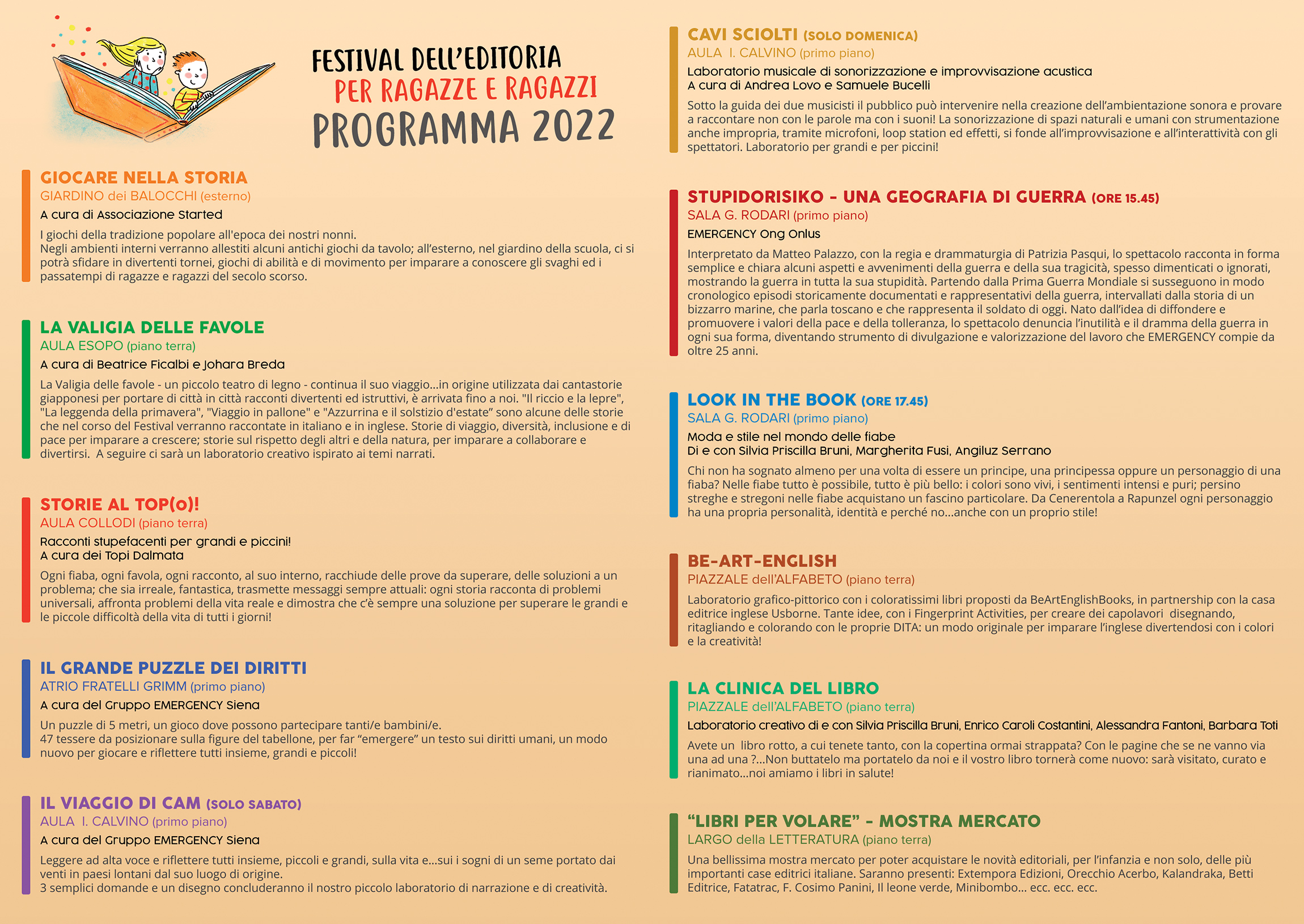 Oltre alla mostra mercato del libro, si svolgeranno numerosi laboratori, narrazioni teatralizzate di favole, giochi a tema e tante altre attività per bambini e ragazzi.