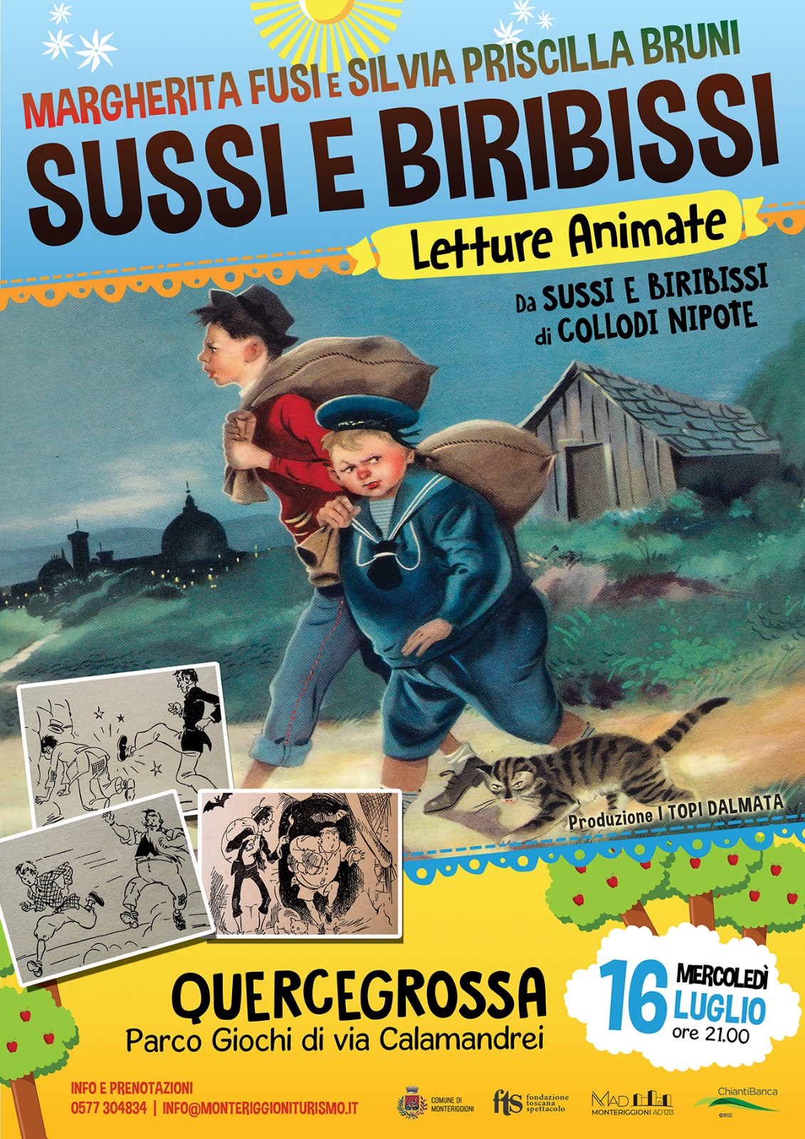 Prende avvio Mercoledì 16 luglio, ore 21.00, Quercegrossa, Parco giochi di Via Calamandrei la rassegna per famiglie che raggiungerà nei suoi appuntamenti le diverse frazioni del Comune. Si inizia con la lettura animata di “Sussi e Biribissi” con Margherita Fusi e Silvia Priscilla Bruni. Portano in scena, con leggerezza, voce, gesti e improvvisazione, il romanzo umoristico scritto da Collodi Nipote, erede dello spirito irriverente di Carlo Collodi. Attraverso le avventure dei due monelli fiorentini la fantasia diventa protagonista.