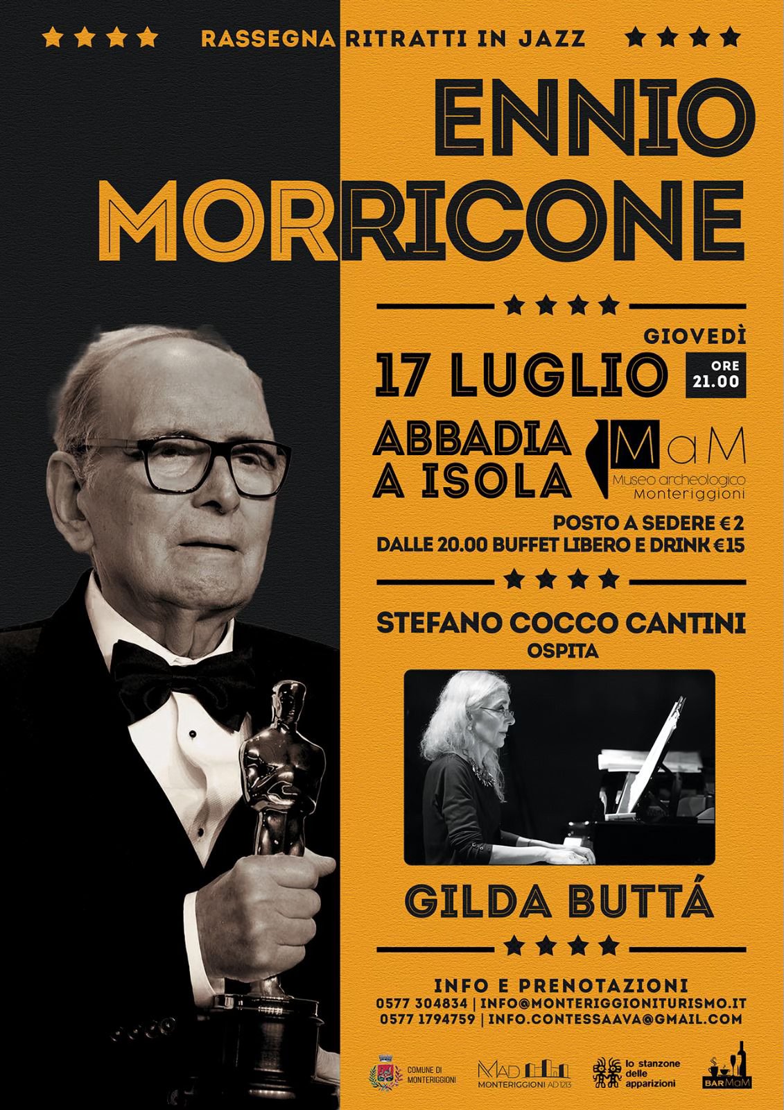 Si prosegue Giovedì 17 luglio, ore 21.00, con la strepitosa rassegna “Ritratti in Jazz” curata magistralmente da Stefano Cocco Cantini che si unirà a Gilda Buttá per una serata dedicata alla musica di Ennio Morricone: un omaggio a una delle figure più iconiche della musica del Novecento. La pianista Gilda Buttá, interprete di livello internazionale e sua storica collaboratrice, eseguirà un programma che attraversa alcune delle colonne sonore più amate del Maestro: melodie che hanno accompagnato i film di registi come Sergio Leone, Giuseppe Tornatore, Brian De Palma.
