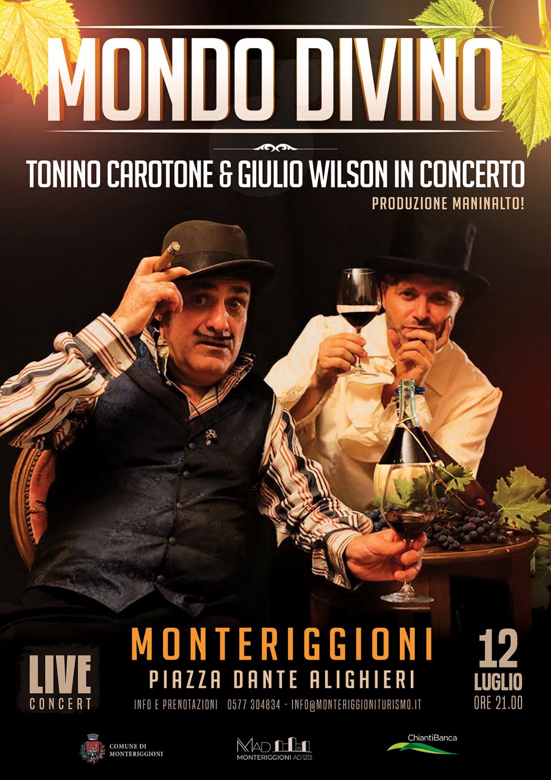 Sabato, 12 luglio, ore 21:00, in Piazza Dante Alighieri – Castello di Monteriggioni, il concerto-spettacolo “Mondo Divino” di Tonino Carotone e Giulio Wilson, nel quale si unisce musica, parole scanzonate e una chiacchierata conviviale intorno al tema del vino. Carotone è noto per il suo stile unico, che mescola canzone d’autore italiana (influenza di Modugno, Celentano, Fred Buscaglione), musica gitana, folk mediterraneo, ironia e spirito bohémien. Giulio Wilson, cantautore e enologo toscano, con l’anima del poeta e l’occhio dell’osservatore sociale, ha saputo costruire uno stile musicale che unisce la delicatezza della canzone d’autore alla denuncia pacata ma incisiva.