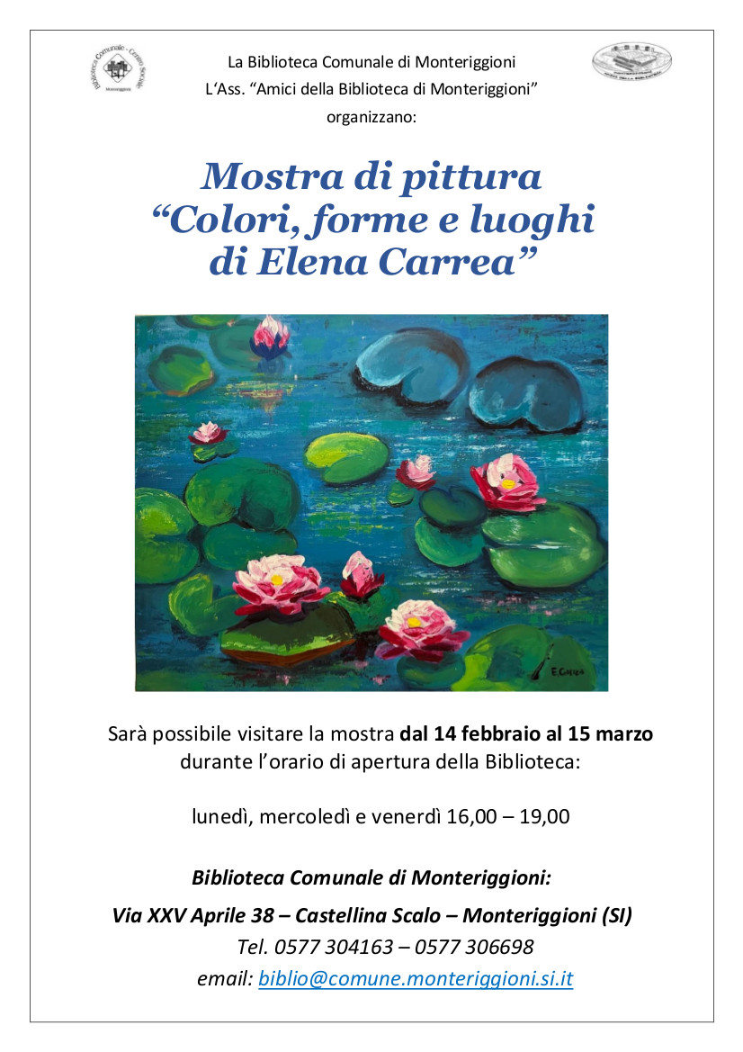 Fino al 15 marzo, presso la Biblioteca di Castellina Scalo, sarà visitabile “Colori, forme e luoghi”: mostra di pittura di Elena Carrea.