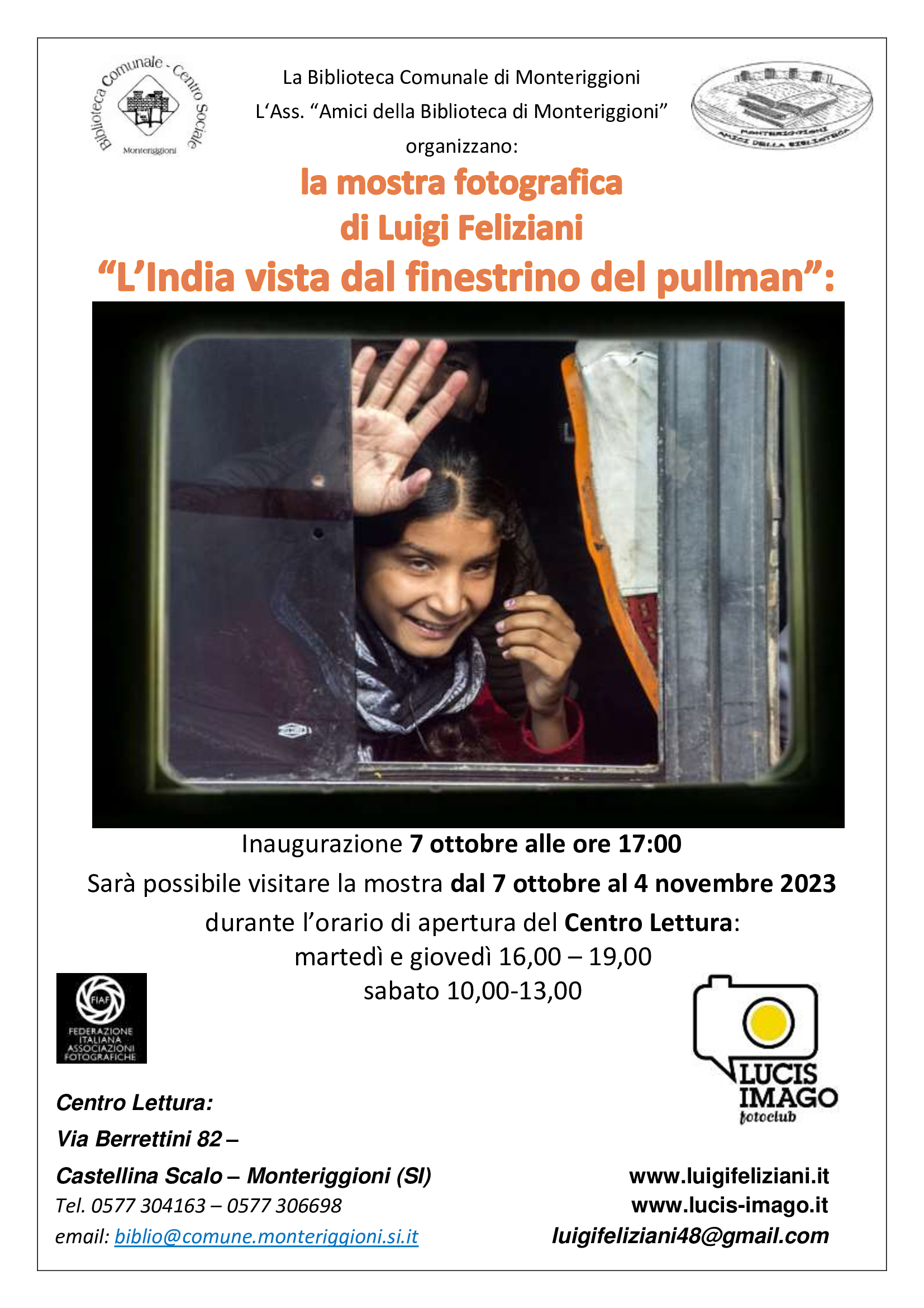 Dal 7 ottobre al 4 novembre, presso il Centro Lettura, Via Berrettini 82, Castellina Scalo, sarà visitabile la mostra fotografica di Luigi Feliziani dal titolo “L’India vista dal finestrino del pullman”.