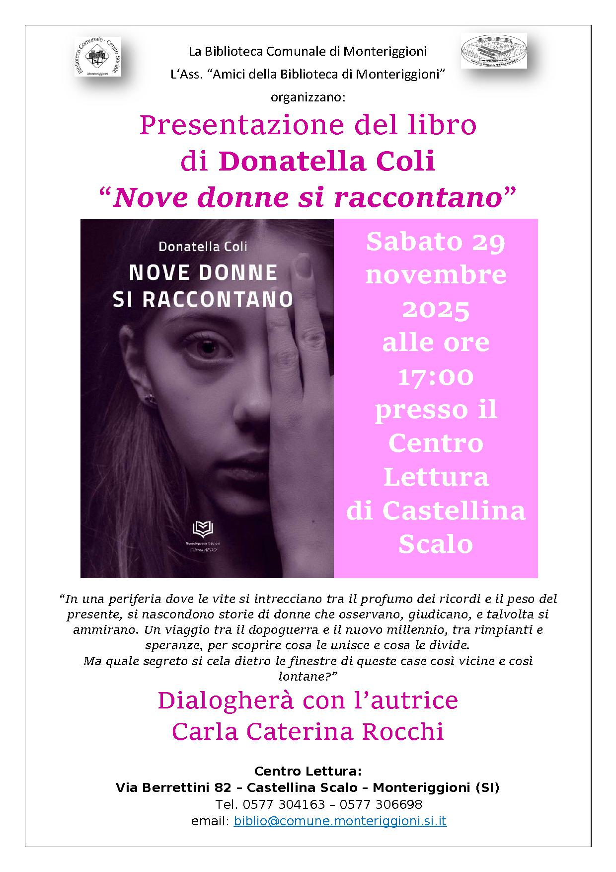 Sabato 29 novembre alle ore 17,00 presso il Centro Lettura, in Via Berrettini 82 a Castellina Scalo, ci sarà la presentazione del libro di Donatella Coli: “Nove donne si raccontano”.
