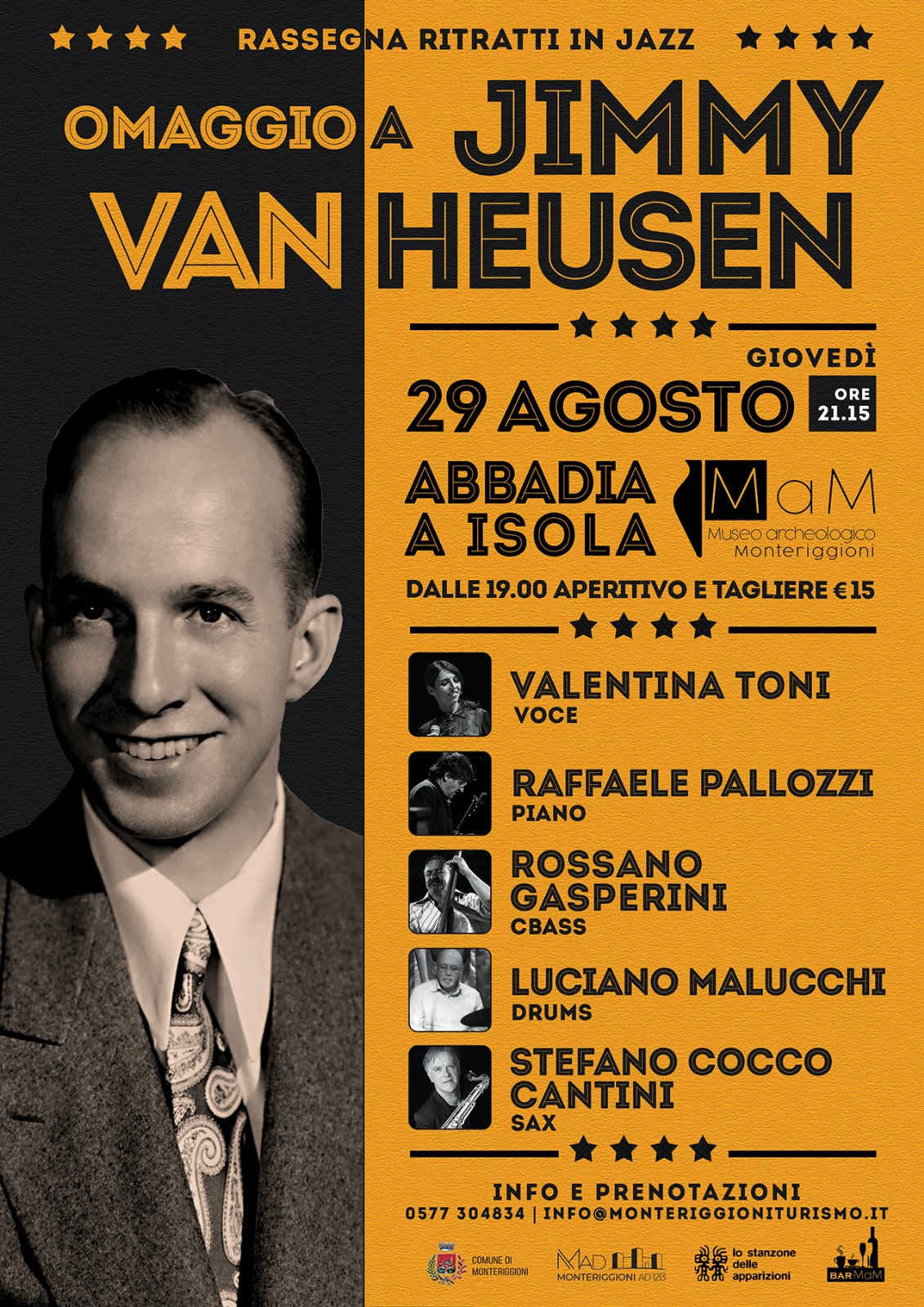 Sarà la volta di rivisitare la musica di Jimmy Van Heusen, con Valentina Toni voce, Raffaele Pallozzi piano, Rossano Gasperini Cbass, Luciano Malucchi drums, Stefano Cocco Cantini sax.