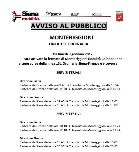 Dal 9 gennaio 2017 sarà attivata la fermata di Monteriggioni (località Colonna) per alcune corse della linea 131 Ordinaria Siena-Firenze e viceversa.