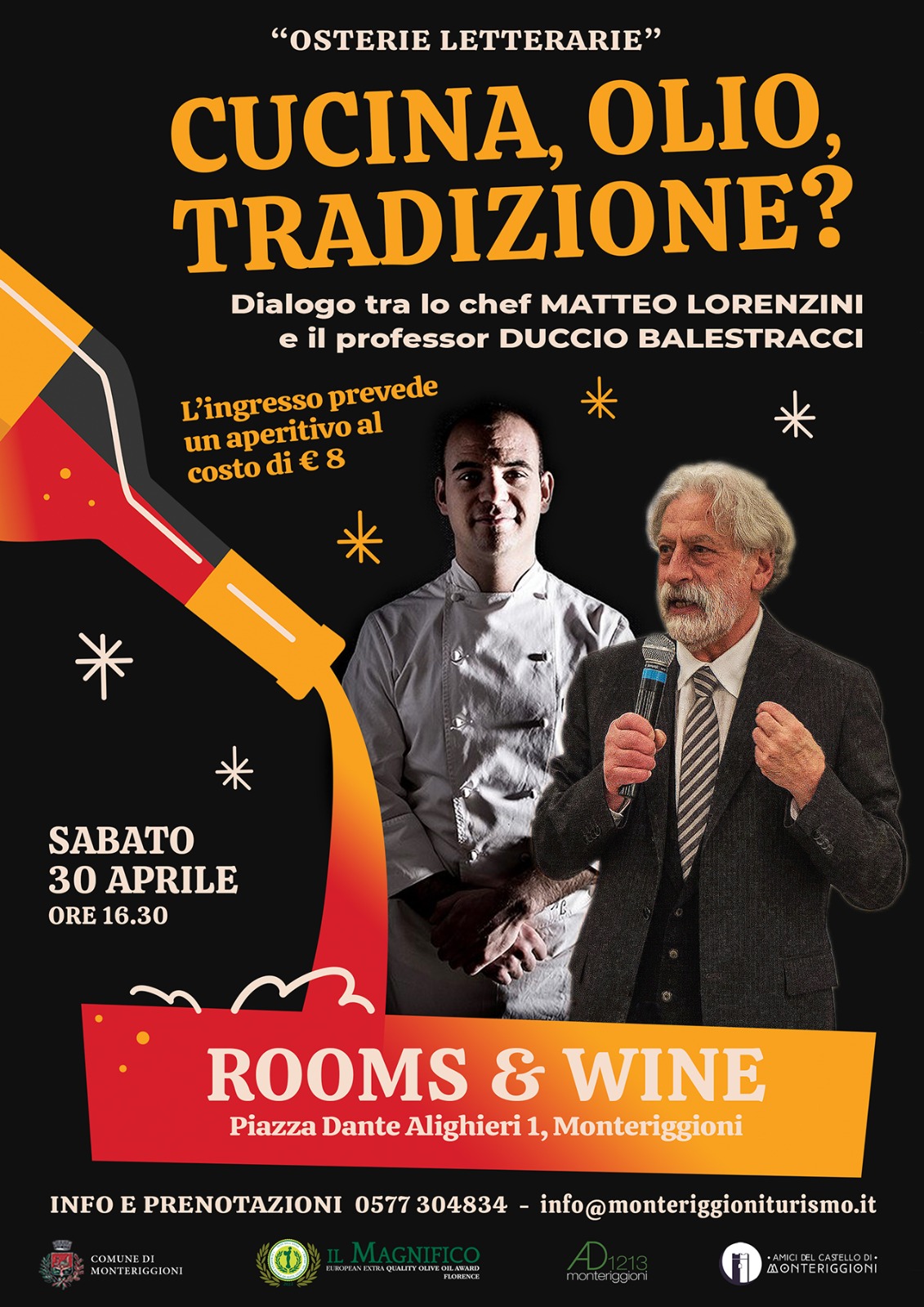 Nell’ambito della manifestazione “IL MAGNIFICO. Oscar Europeo dell'Olio - European Extra Quality Olive Oil Award Florence”, il 30 aprile, alle 16,30, presso Rooms & Wine, Piazza Dante Alighieri (Monteriggioni-SI) si terrà l’Osteria Letteraria