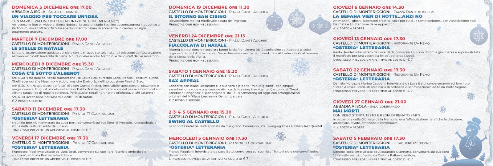 In allegato il programma degli eventi promossi dal comune di Monteriggioni dal 5 Dicembre 2021 al 5 Febbraio 2022.