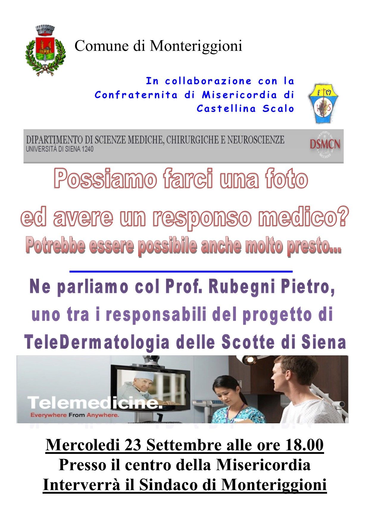 Il Comune di MOnteriggioni in collaborazione con la Confraternita Misericordia di Castellina Scalo, organizza un incontro con il Prof. Rubegni Pietro per parlare delle nuove frontiere della TeleDermatologia.