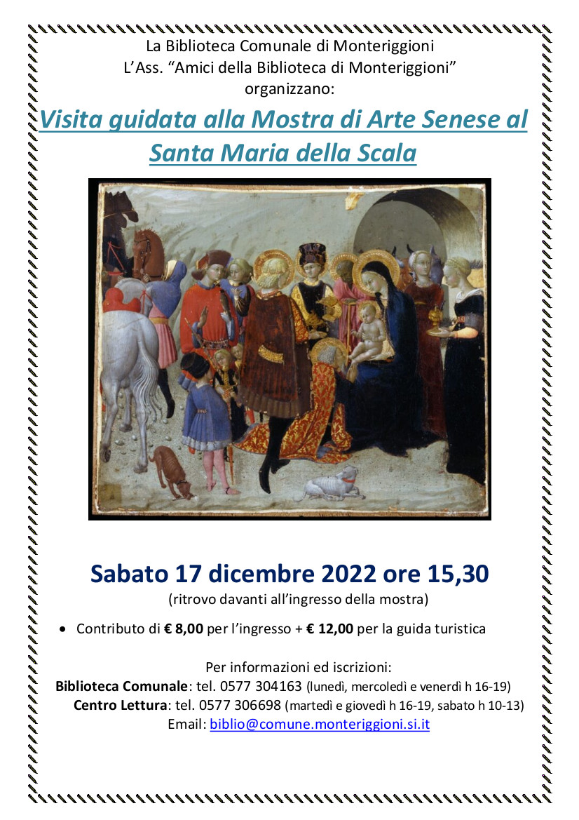Sabato 17 dicembre 2022 alle ore 15,30 la Biblioteca Comunale di Monteriggioni (SI) organizza una visita guidata alla Mostra di Arte Senese al Santa Maria della Scala di Siena.