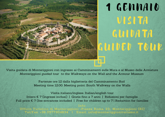 Il 1 Gennaio 2019 alle ore 12 si svolgerà una visita guidata del al Castello di Monteriggioni inclusiva degli ingressi ai camminamenti sulla cinta muraria e al museo "Monteriggioni in Arme".