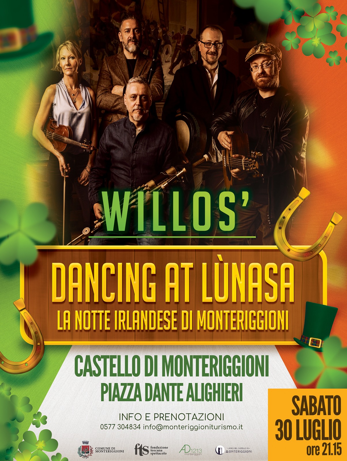 “Dancing at Lùnasa”, la notte irlandese di Monteriggioni organizzata dai grandi Willos’; una giornata ricca di eventi, in compagnia di ballerini, cornamuse , un buon vino e delle sorpresa al culmine della quale (ore 21,30) si terrà il concerto conclusivo dei Willos’ che presenteranno anche il loro ultimo disco: FromNowOn. Atmosfere suggestive, danza e musica celtica che ha sempre avuto successo in questa ormai duratura collaborazione con la band composta da Stephanie Martin, Fiona King, Lorenzo Del Grande, Luca Mercurio, Giulio Putti e il maestro Massimo Giuntini.