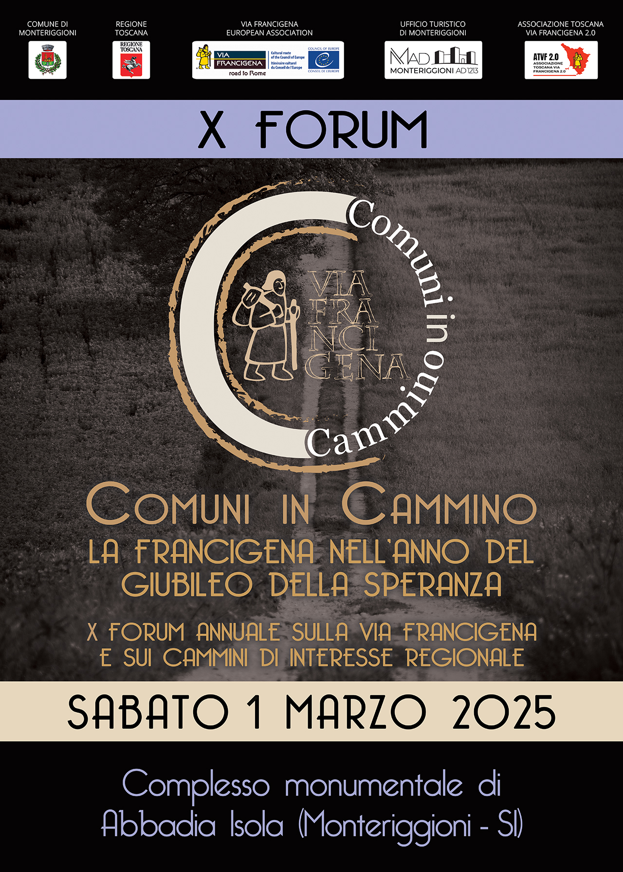 Sabato 1 Marzo 2025, presso il complesso monumentale di Abbadia Isola (Monteriggioni-SI), si svolgerà il X Forum annuale sulla Via Francigena e sui Cammini di interesse regionale “Comuni in Cammino. La Francigena nell’anno del Giubileo della Speranza”.