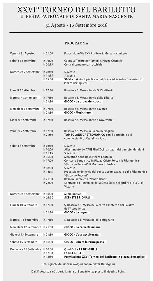 Dal 31 Agosto al 16 Settembre, nella frazione di Castellina Scalo (Monteriggioni-SI), si svolgerà la XXVI edizione del Torneo del Barilotto e Festa di S. Maria Nascente, con festeggiamenti in onore della Nascita di Maria e giochi e sfide fra i rioni del paese.